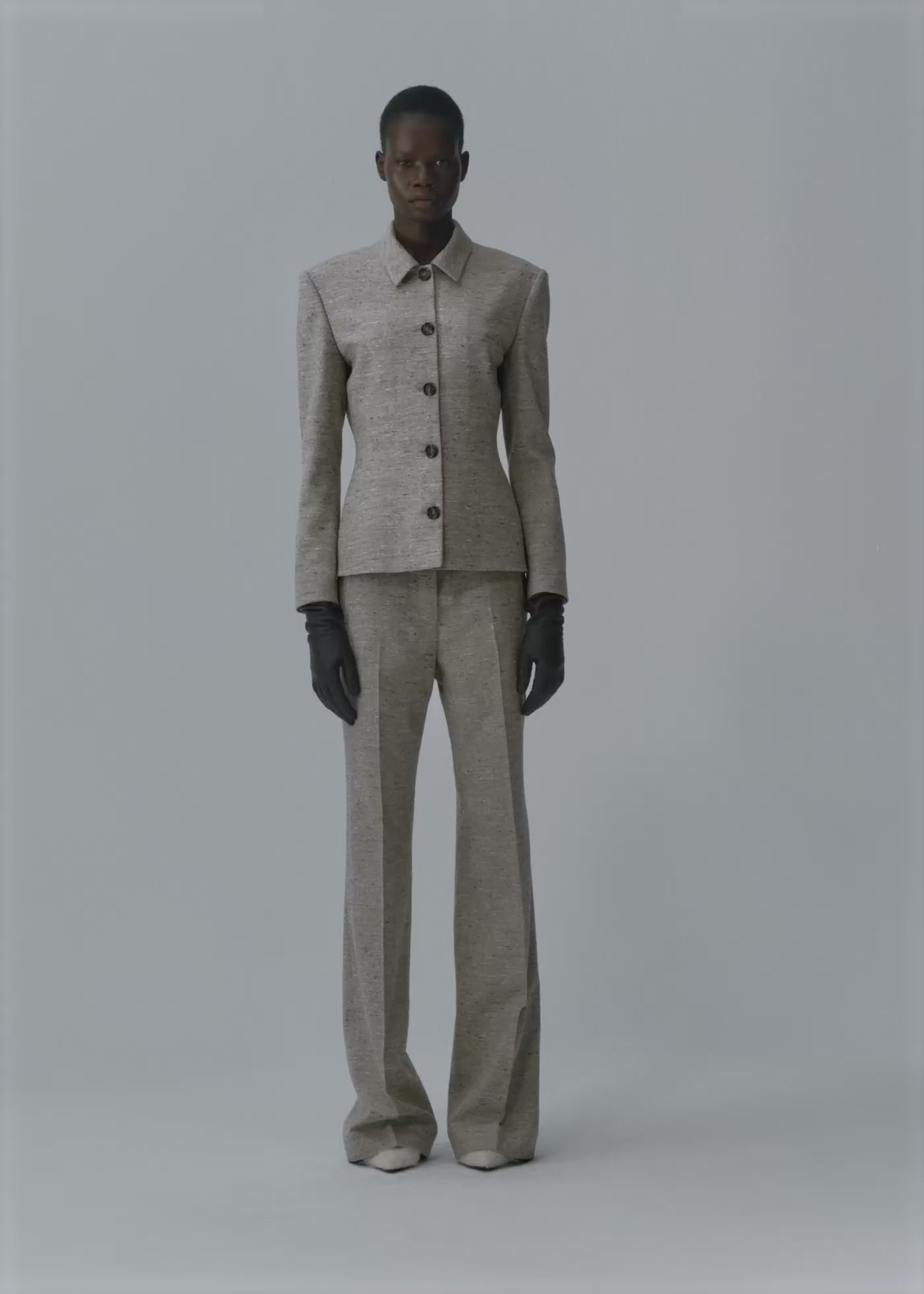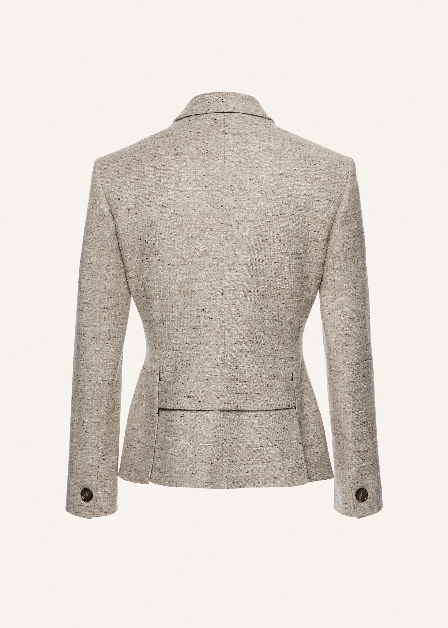 This fitted blazer is crafted from a luxurious blend of silk and cashmere and tailored to subtly enhance the natural waist, creating a soft hourglass silhouette. It features a classic shirt-style collar, button-down front, and structured shoulders, combining timeless elegance with modern precision.