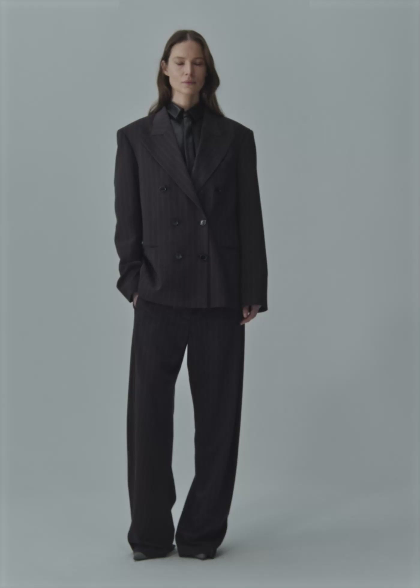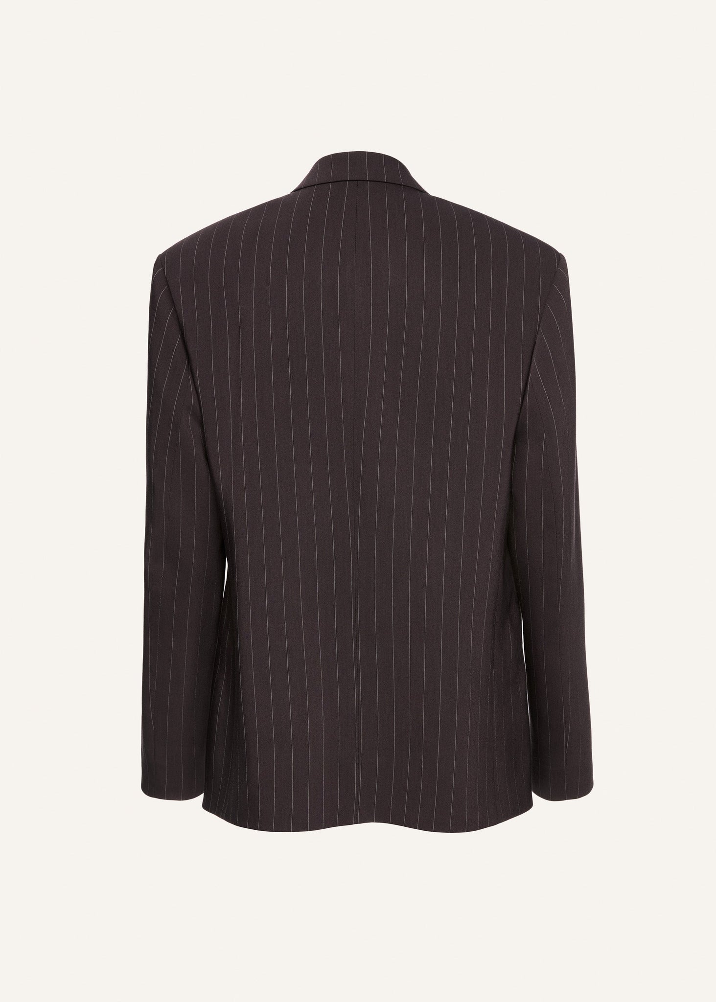 A classic double-breasted blazer with sharp tailoring and an oversized silhouette, crafted in a rich espresso hue with fine vertical pinstripes. Strong shoulders and elongated lapels elevate the masculine-inspired cut, while subtle waist shaping softens the structure for a refined and modern finish.