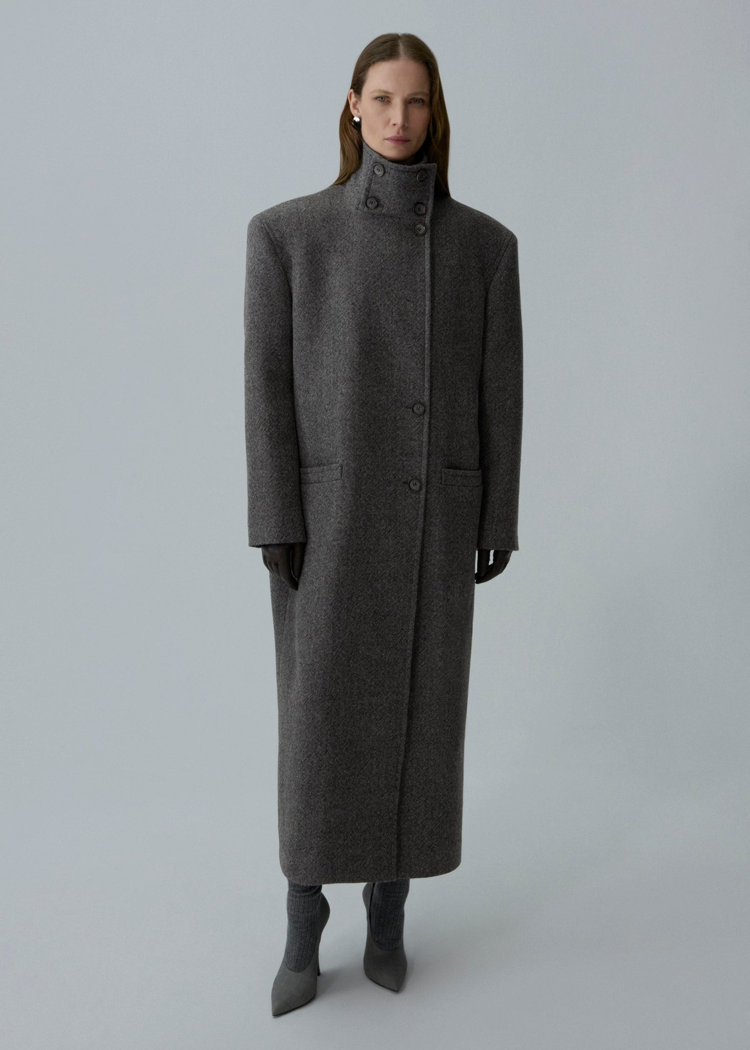Oversized wool coat in red featuring a high collar, minimalist button details at the collar and waist, and open front pockets for a bold, cozy look.