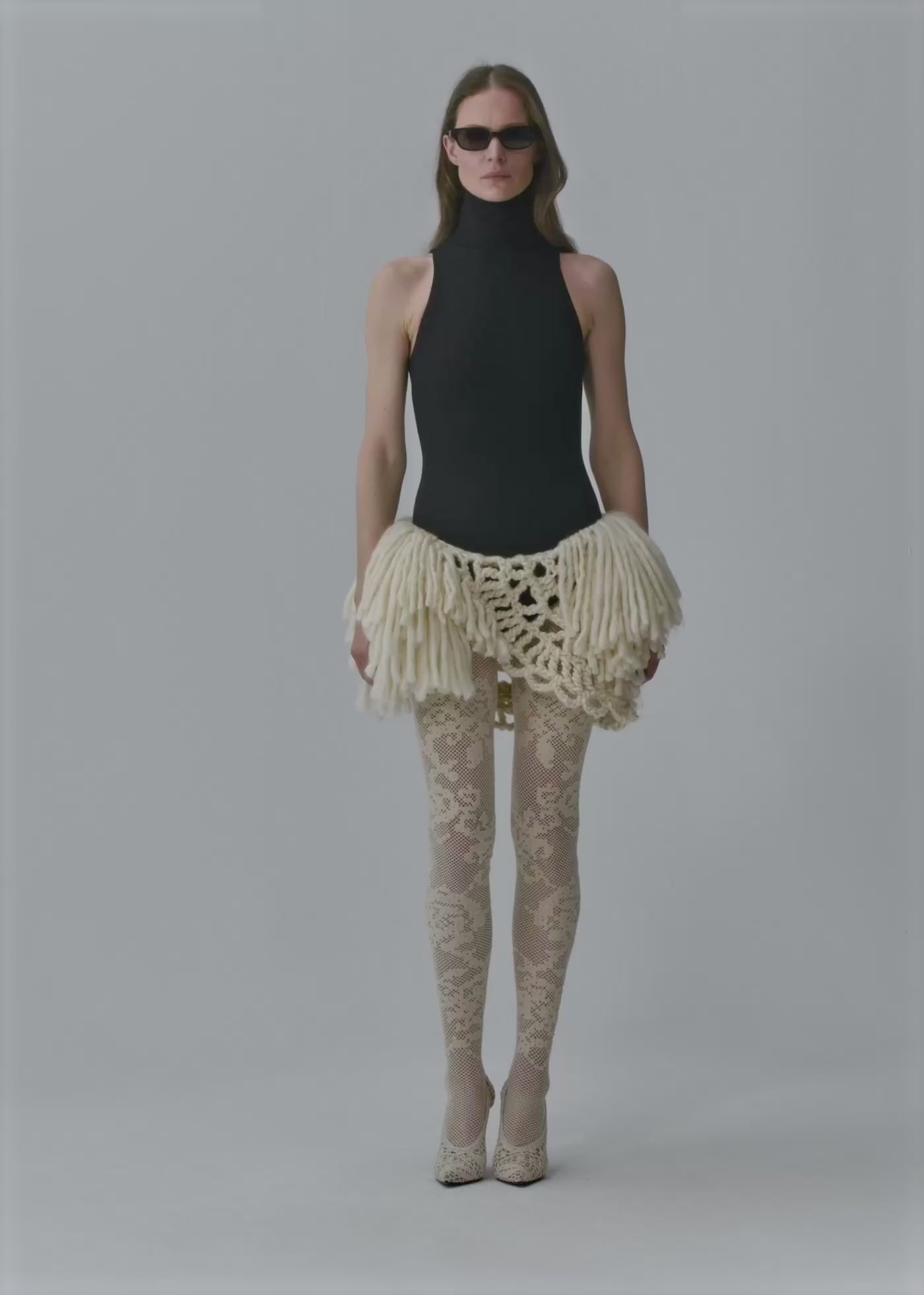 A standout piece from the Fall-Winter 2025 collection unveiled during Paris Fashion Week. This sculptural evening look combines a sleek black sleeveless bodysuit with a dramatic hand-crocheted skirt in cream wool yarn. The skirt, attached directly to the bodysuit, features exaggerated fringe and open-weave details, creating volume and movement for a one-of-a-kind silhouette.