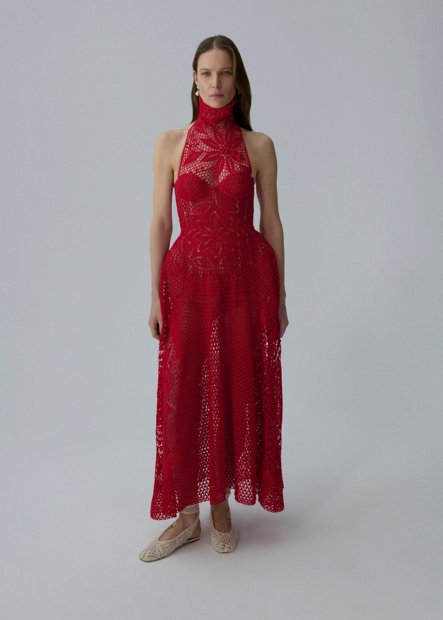 A handmade crochet midi dress in Magda’s signature shade of red. This standout evening piece features a sculpted bustier and a exaggerated hip line. The floral crochet pattern continues seamlessly through the bodice and skirt, creating a strong feminine silhouette. For a striking monochrome look, style with the matching high-neck blouse in the same hue.