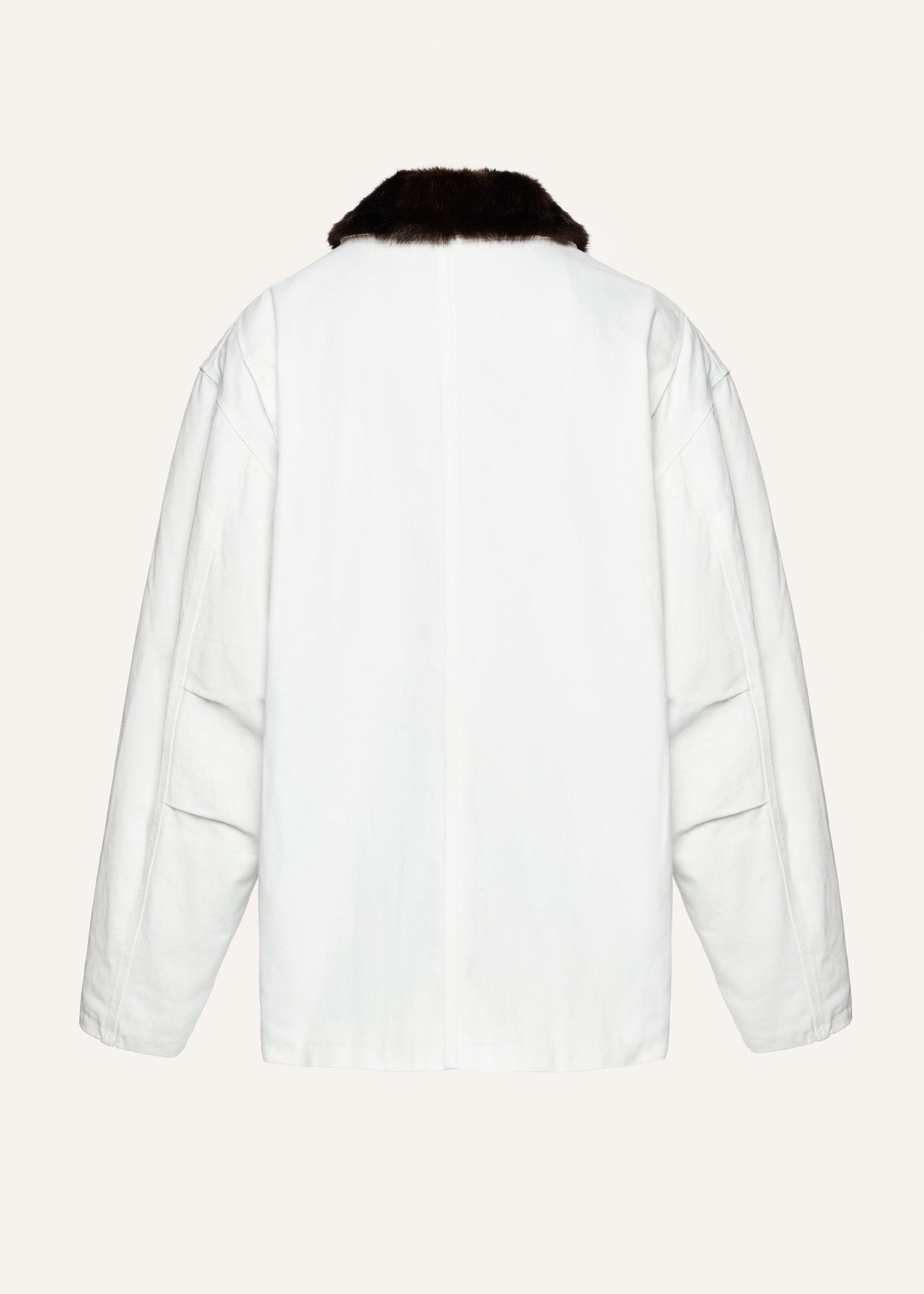A structured oversized denim jacket with a modern boxy silhouette, featuring a plush faux fur collar for a seasonal update. Designed with front flap pockets, a concealed button placket it merges utilitarian style with soft luxury.