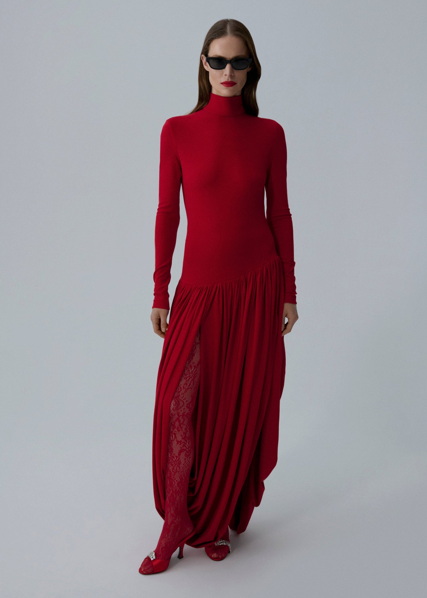 A long, figure-hugging gown with a high turtleneck collar and full-length sleeves. The sleek silhouette is contrasted by a voluminous draped skirt gathered at the hips, featuring open panels along the front and sides that add movement and a subtle reveal. Crafted with a stretch bodice and a lightweight draped lower half for a modern, fluid finish. Closed at the back with an invisible zip.