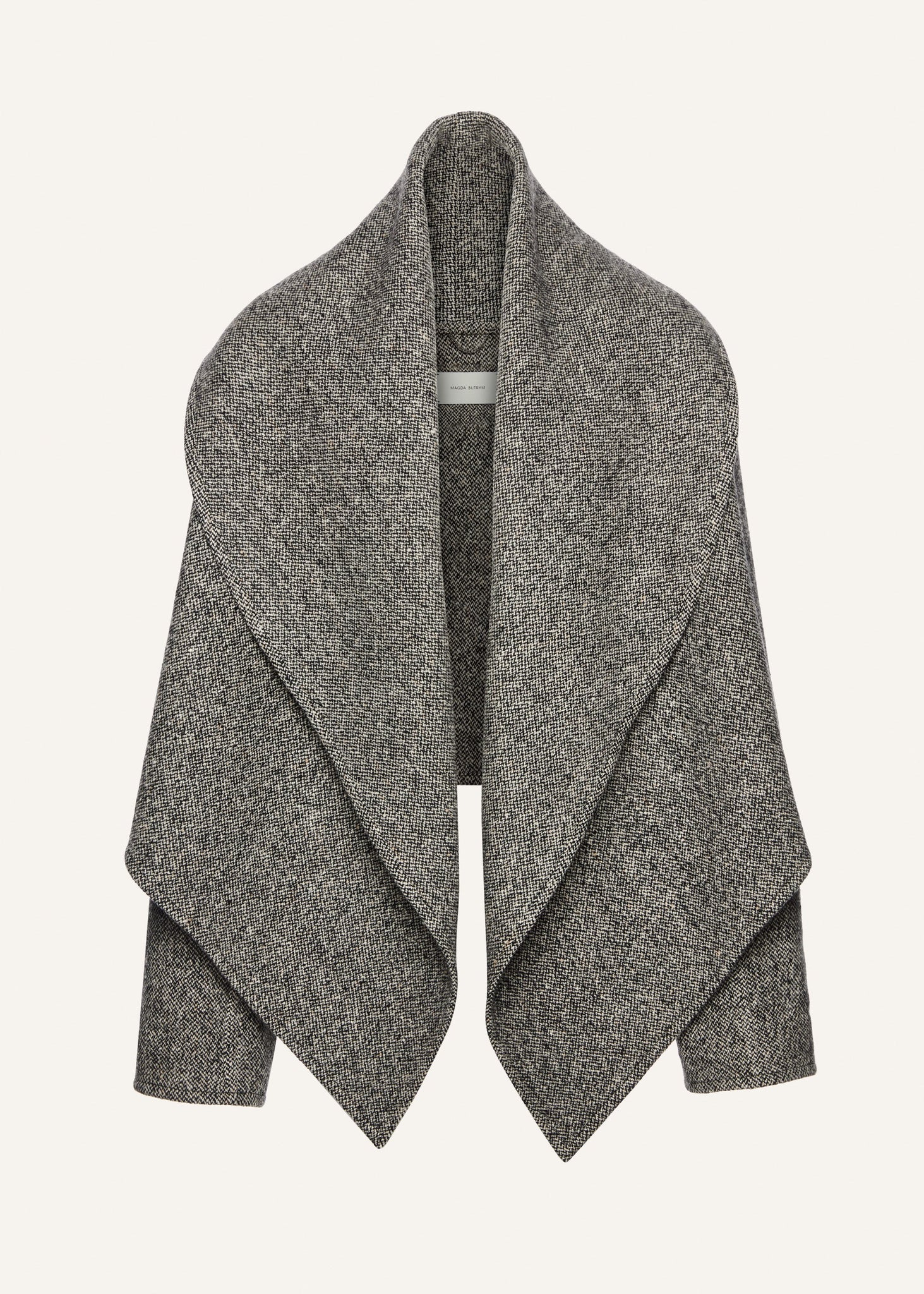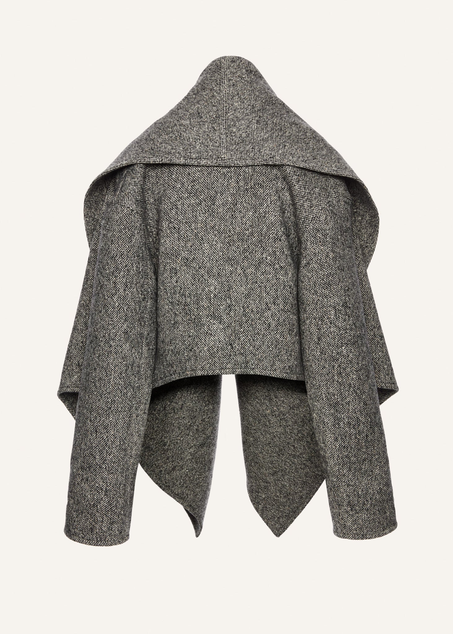 This wool and cashmere blend jacket features an oversized shawl collar that cascades effortlessly into wide front panels. Designed without closures, it drapes naturally for a relaxed, enveloping silhouette.