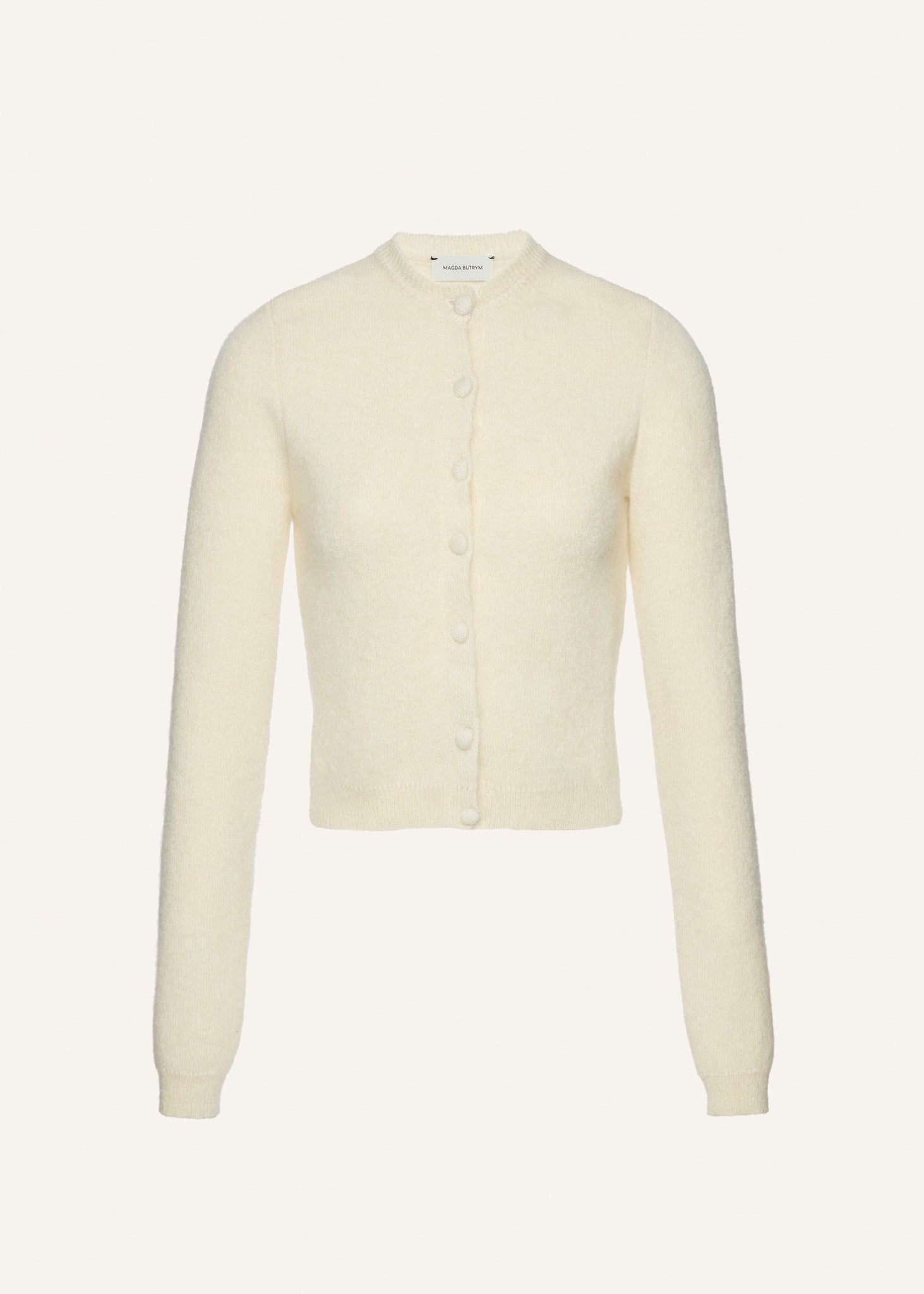 Designed with a close fit to the body, it features a round neckline, tonal covered buttons, and ribbed trim detailing at the cuffs and hem. The minimalist shape is elevated by its luxe texture.