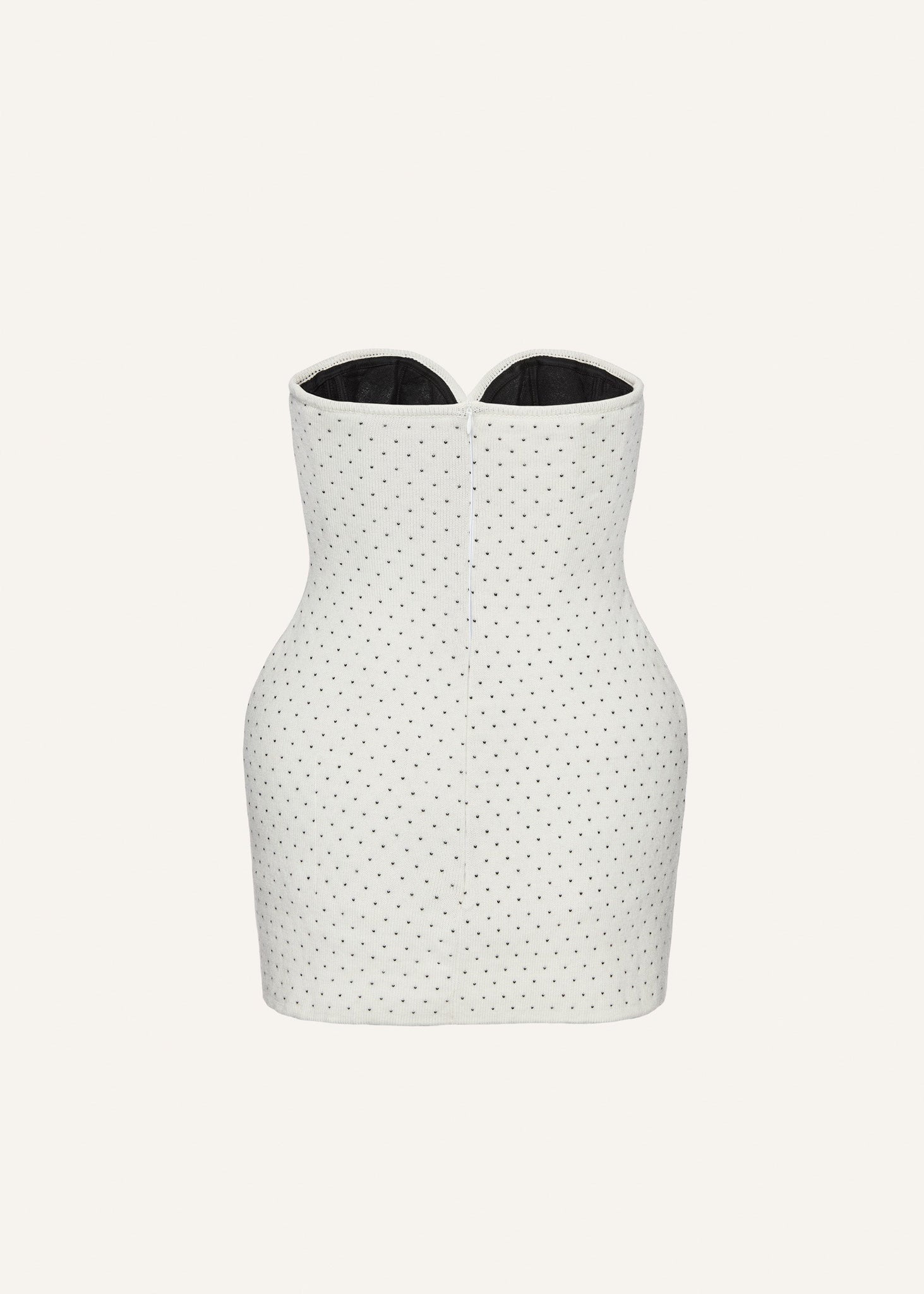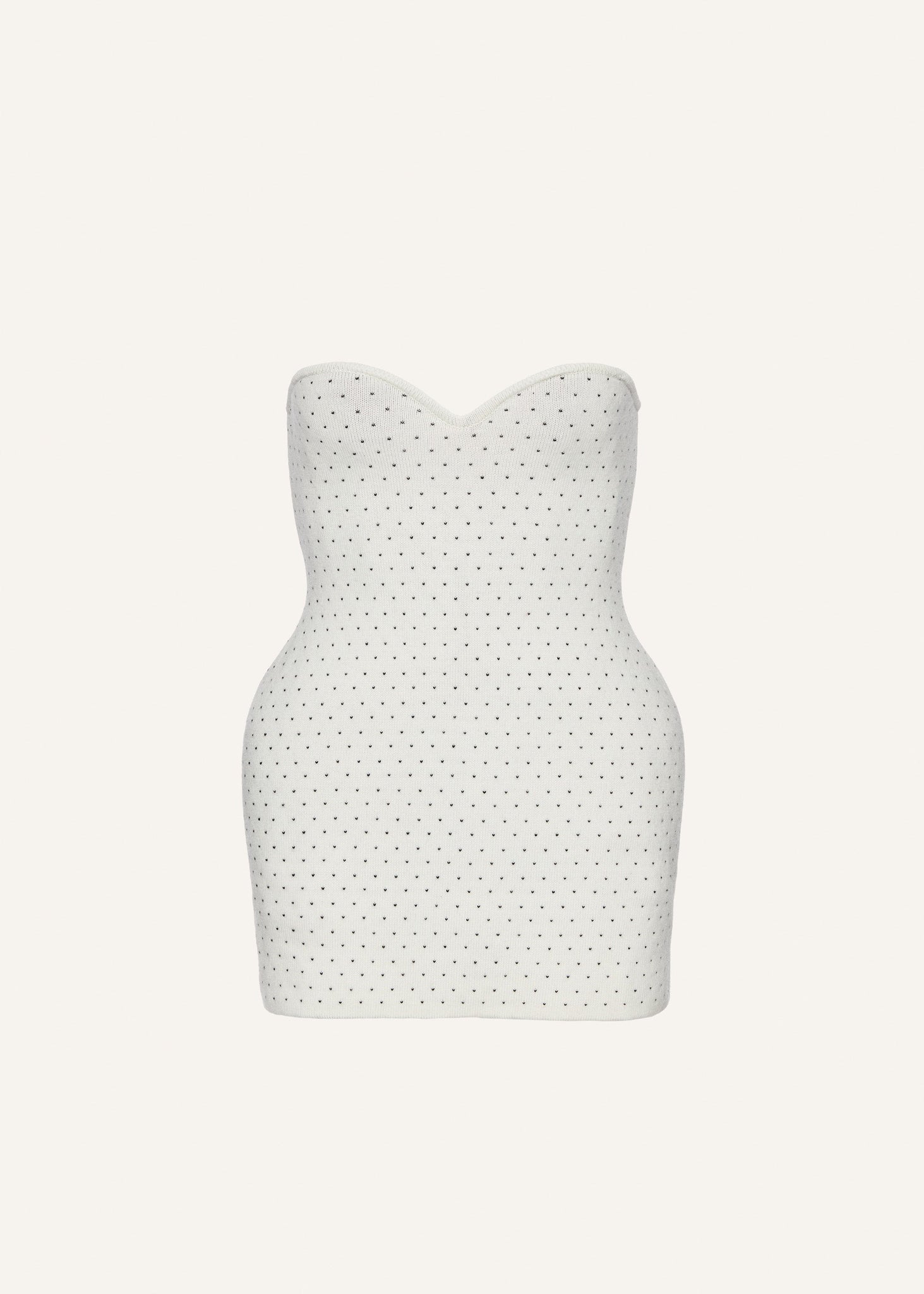 A sculpted strapless mini dress made from wool, designed to contour the body with a form-fitting silhouette. The sweetheart neckline adds a feminine touch. Ideal for styling as a standalone statement piece or layering with tailored outerwear.