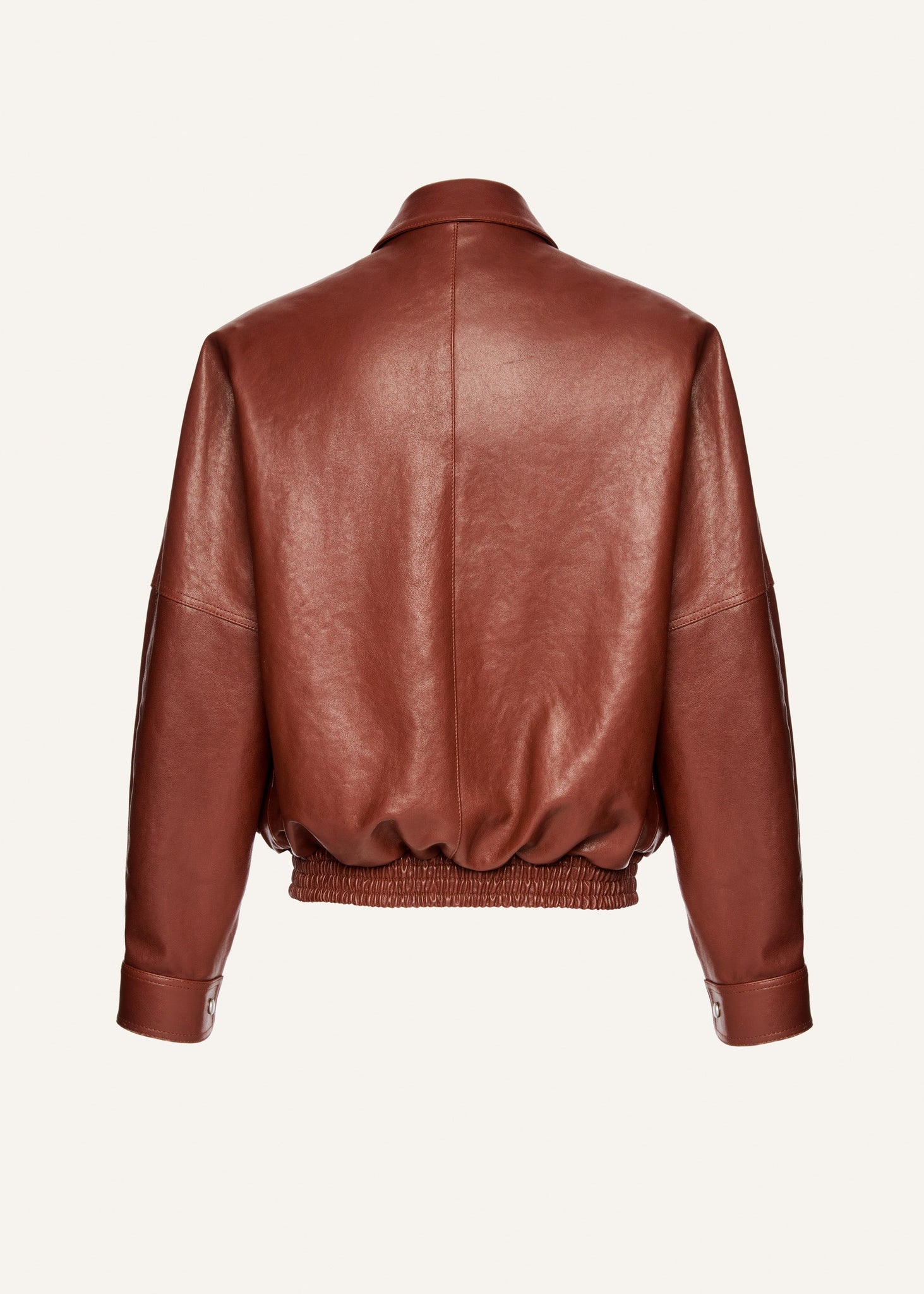 Leather bomber jacket with a sharp design. Crafted from smooth black leather, it features exaggerated slanted flap pockets.The silhouette is cinched at the hem with an elastic band for a tailored fit. Full zip closure, structured collar, and snap-button cuffs. Reimagination of the classic bomber in an architectural form.