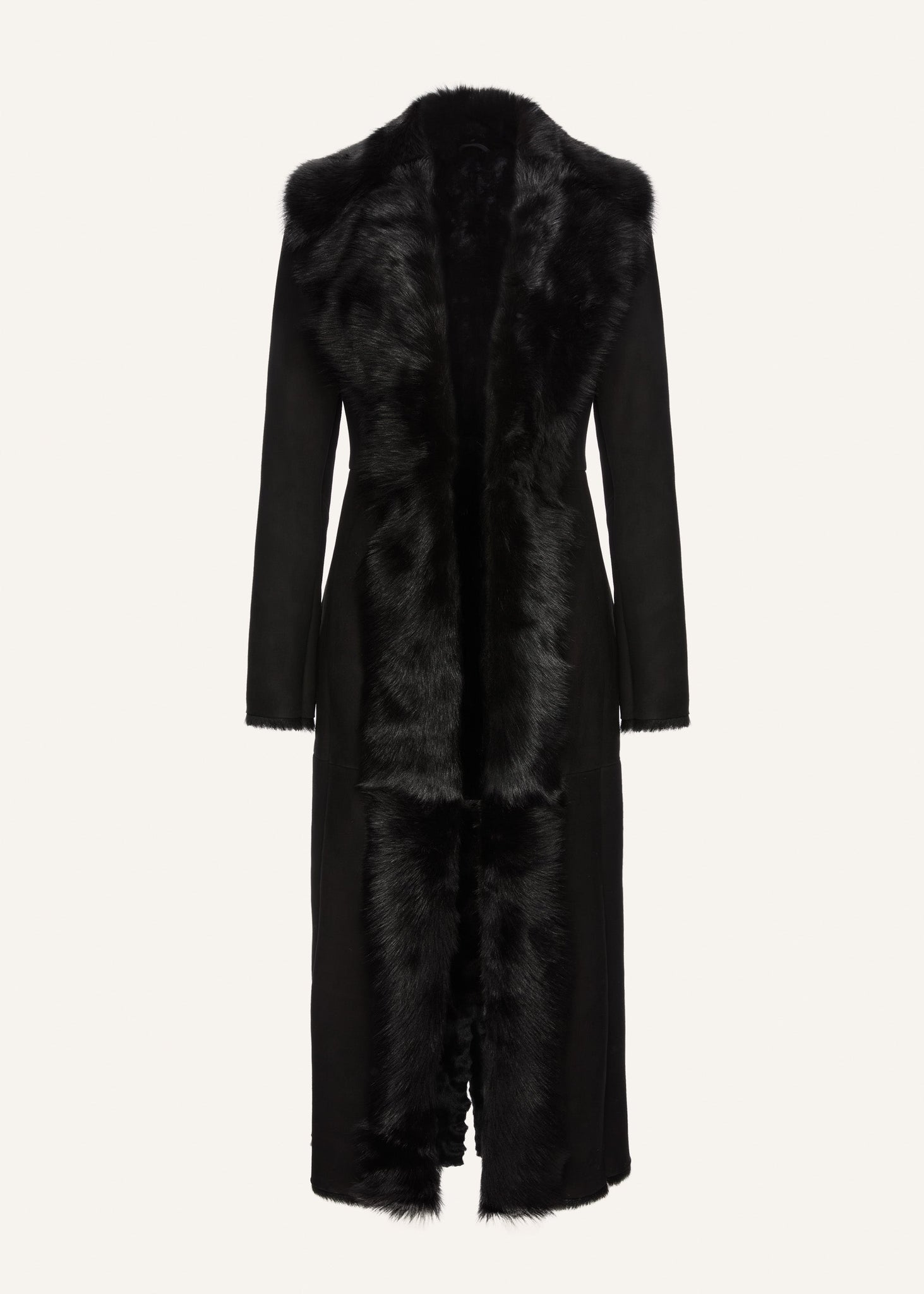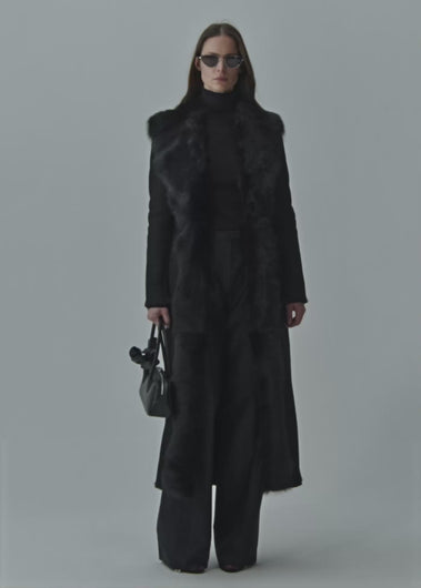Long tailored coat in supple black shearling leather, featuring plush fur trim along the collar and front opening.