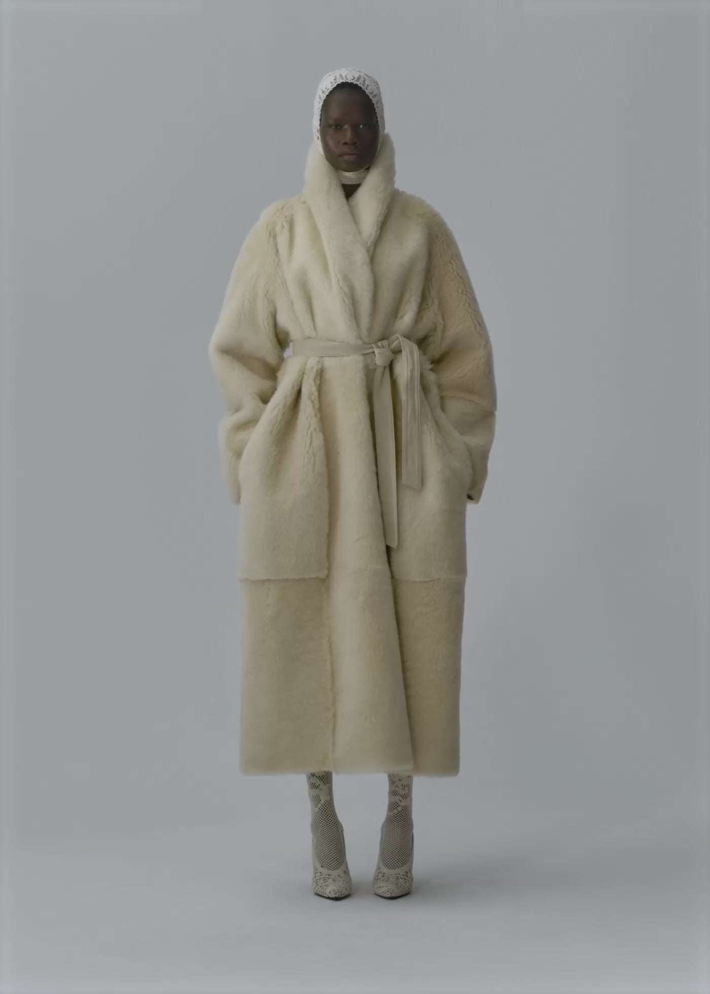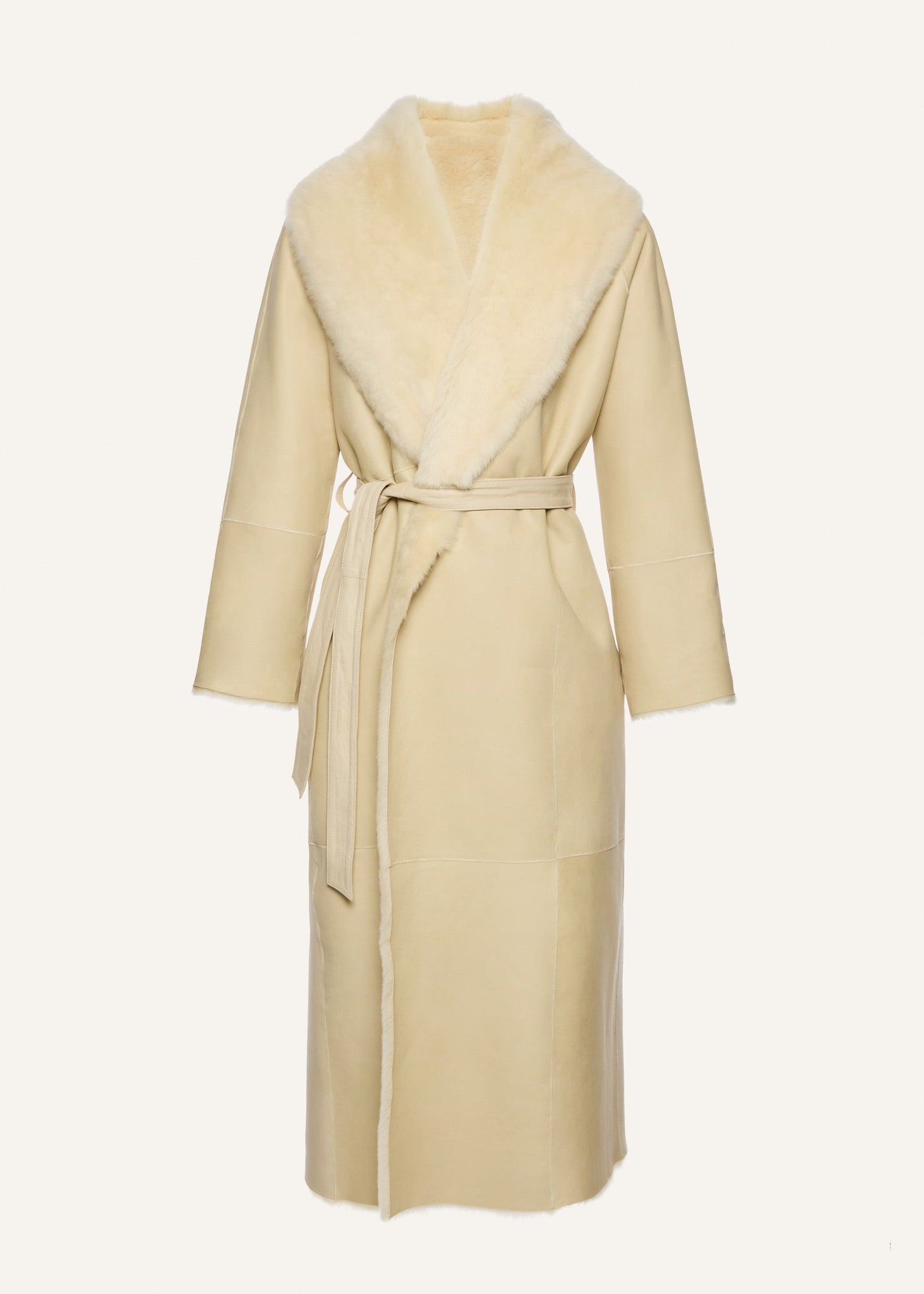 A full-length coat crafted from shearling, designed to be worn on either side. One side reveals a plush shearling surface with soft texture and volume, while the reverse showcases smooth leather with subtle seam detailing. The generous shawl collar, wide sleeves, and self-tie belt create a sculptural silhouette that drapes effortlessly.