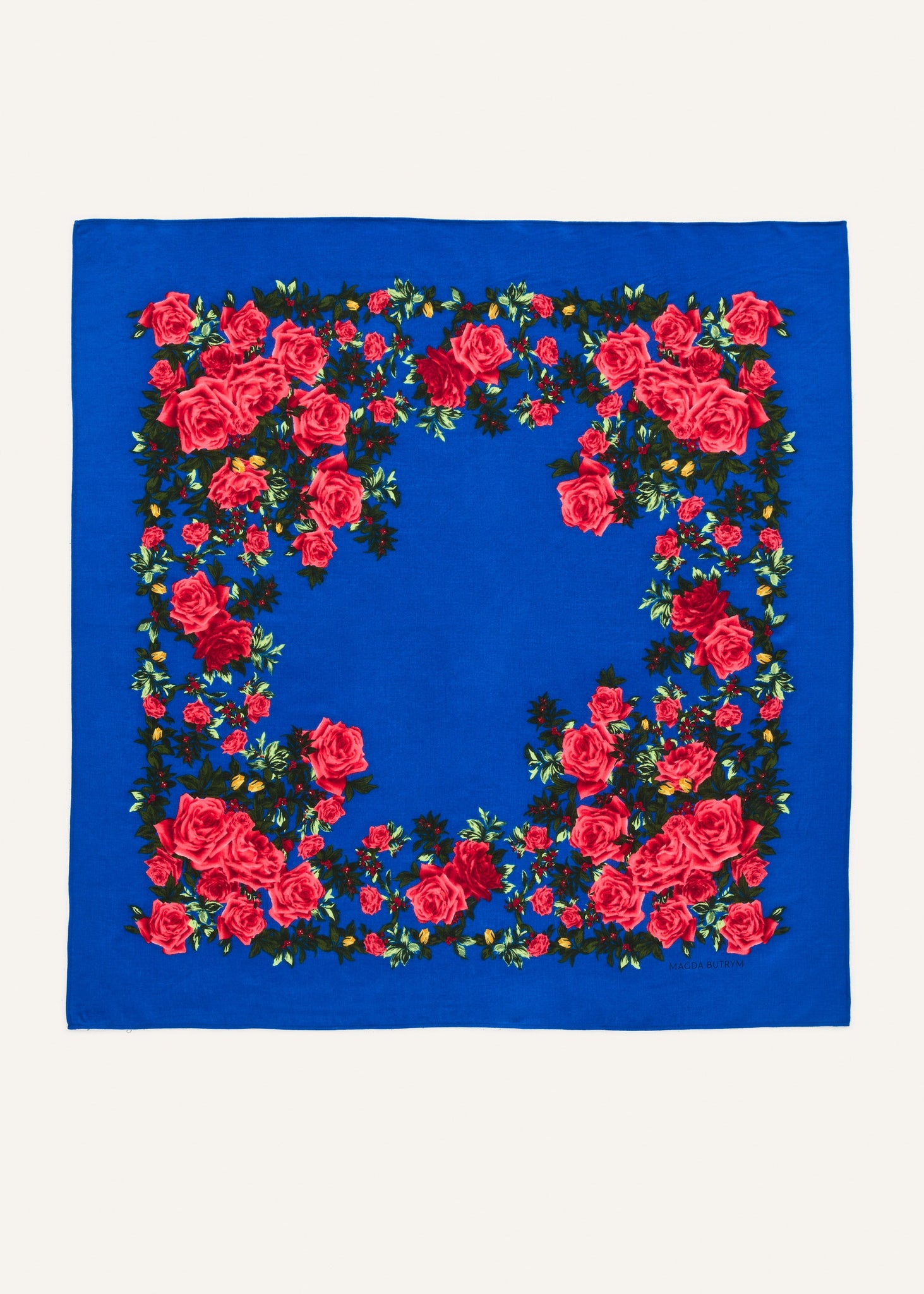 Crafted from soft wool, this scarf features a striking royal blue base adorned with vibrant red rose clusters and rich green foliage. The bold floral motif adds a romantic contrast to the cozy, textured fabric, making it a statement piece for cooler seasons. Style it draped over the shoulders, wrapped around the neck, or tied as a headscarf to add warmth and elegance to any outfit.