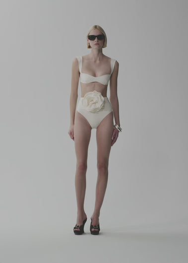 A high-waisted, high-leg swim bottom with a ruched, belt-like detailing which gathers at the center and features a large removable flower applique, which can also be pinned onto matching bandeau tops.