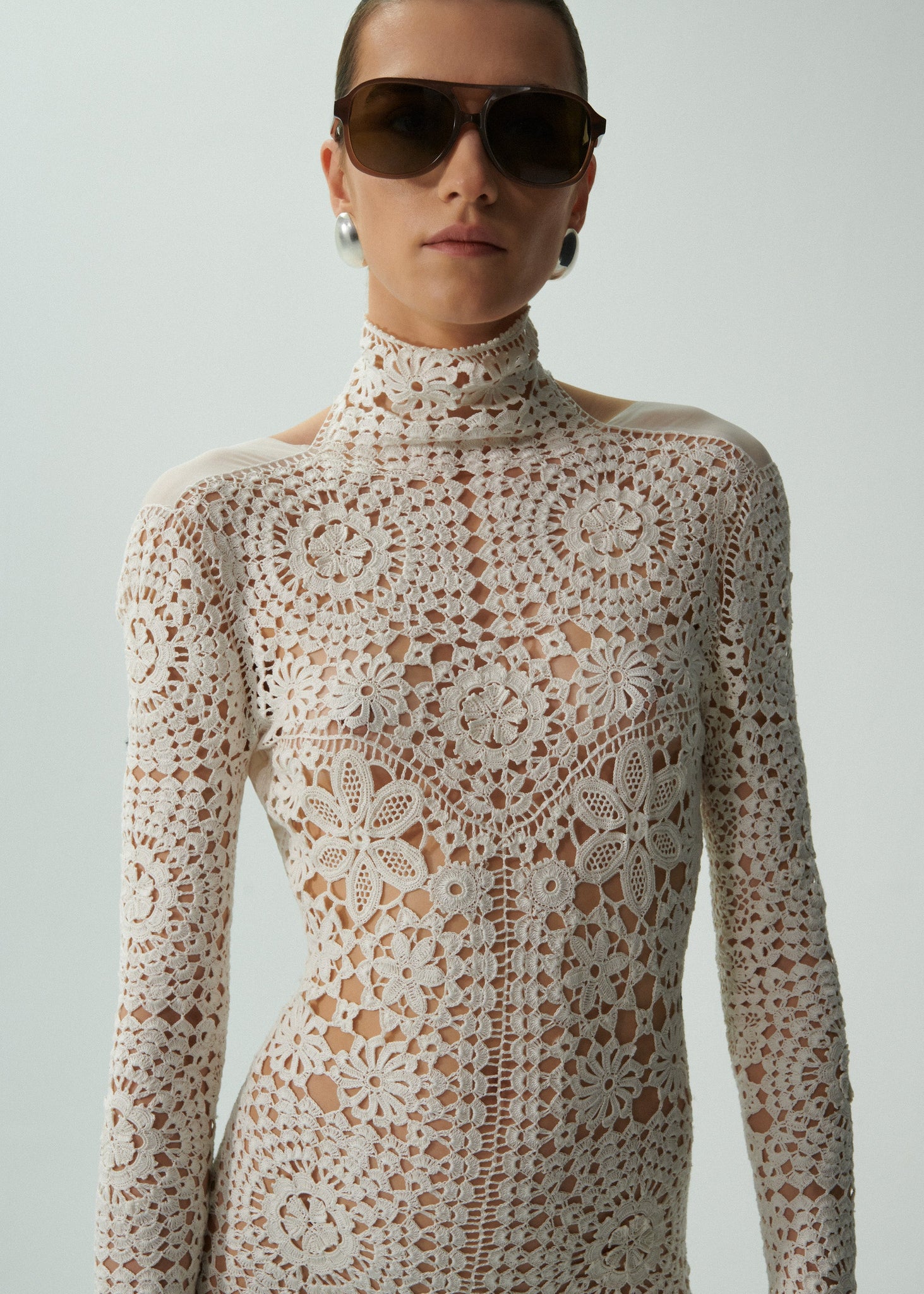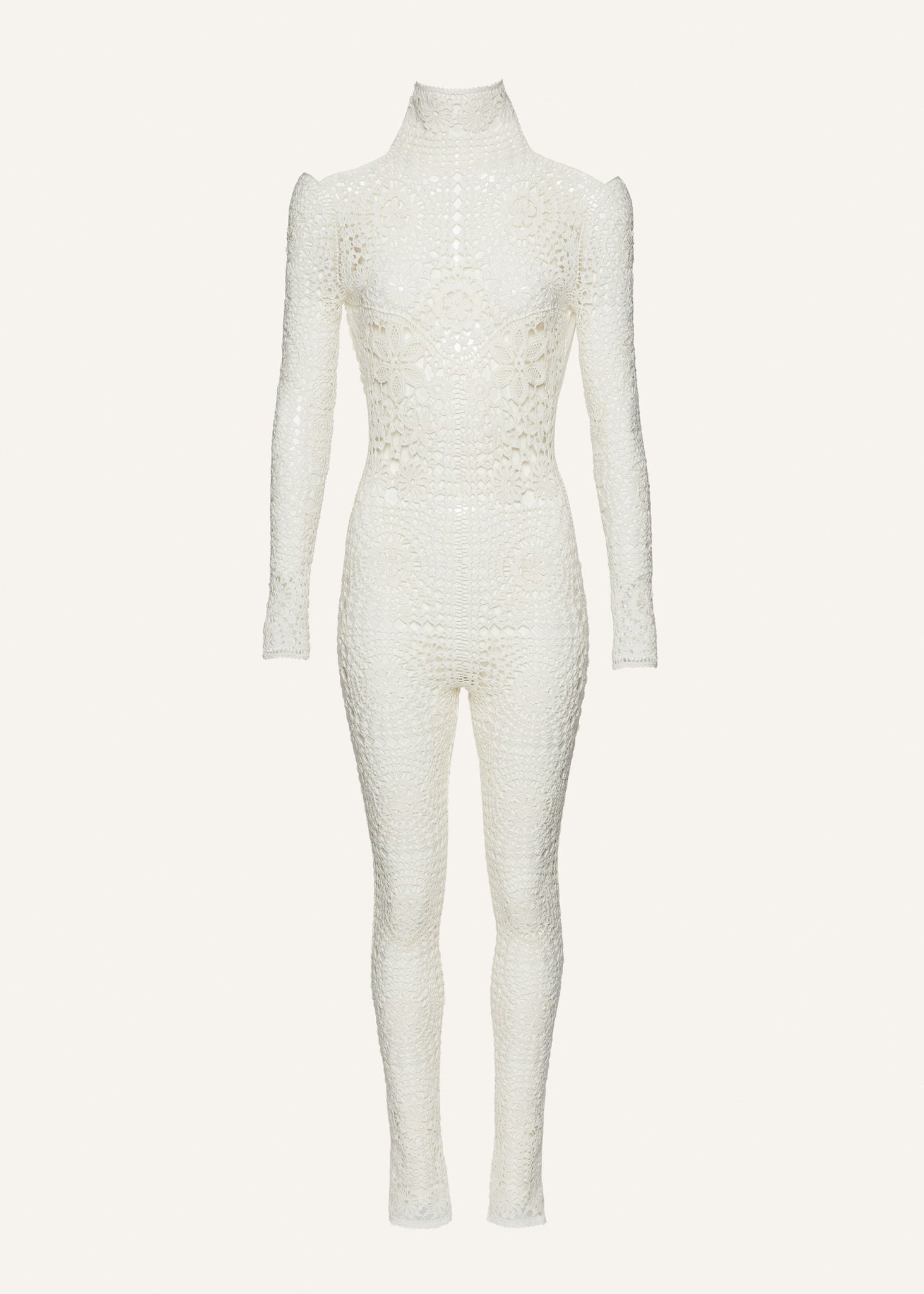 A one of a kind and completely handmade piece, this lace jumpsuit is a true display of Polish craftsmanship. Made from a special lace embroidery technique originating from the city of Koniakow, Poland, this piece exemplifies a centuries-old tradition of lace craftsmanship. Magda worked closely with the Koniakow Lace Foundation, aimed at preserving the craft, to create this high neck, full body catsuit in all over lace.
