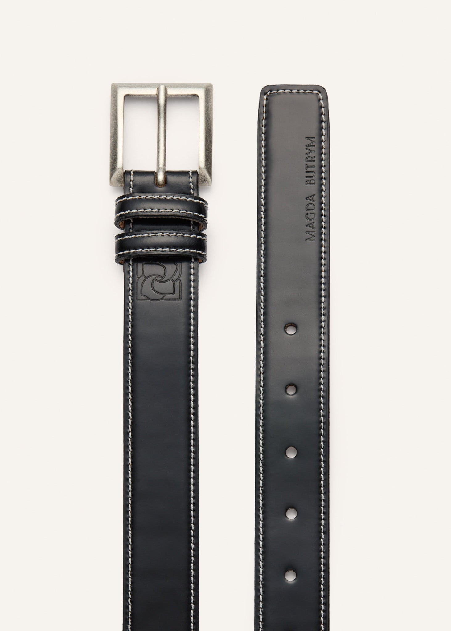 A timeless black leather belt featuring a sleek gold-tone square buckle for a polished finish. The minimalist design and adjustable fit make it a versatile wardrobe essential, perfect for cinching dresses or pairing with tailored trousers.