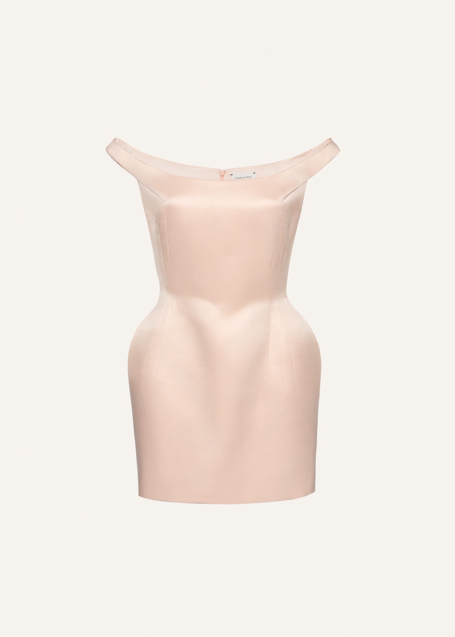 This ladylike mini dress is made from silk fabric and creates an hourglass shape by using hip pads and a fitted bodice, complemented by a rounded off-shoulder neckline.