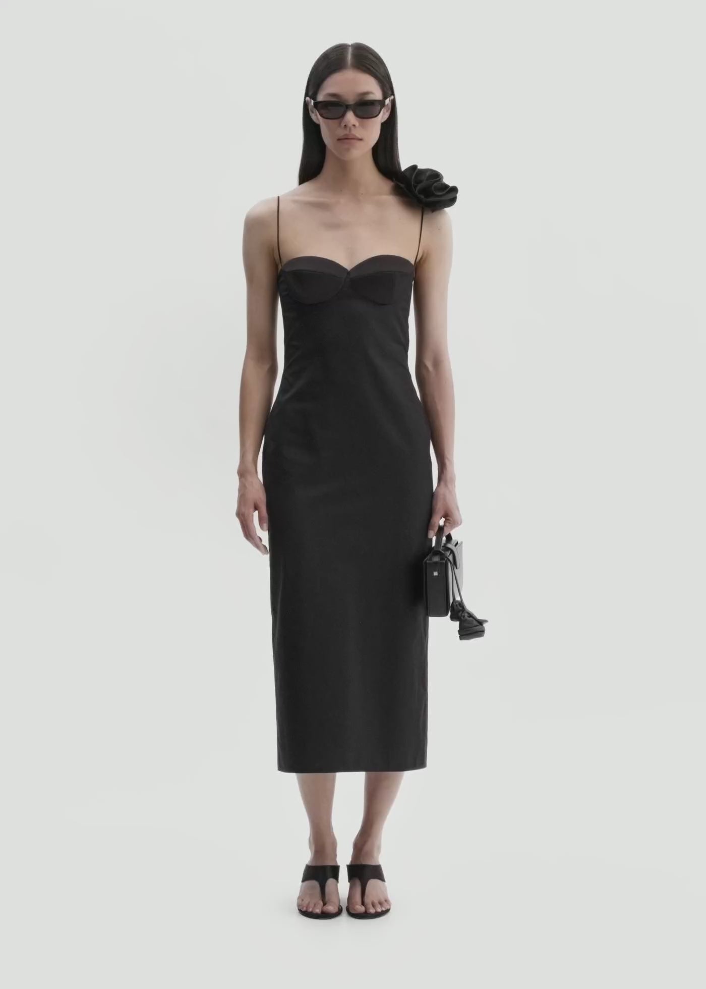 A romantic midi dress featuring a structured bustier bodice with delicate spaghetti straps and a sweetheart neckline. Cut from flowing silk in classic black, the silhouette softly skims the body and falls to a mid-length hem. A floral appliqué at the strap adds a signature Magda Butrym touch.