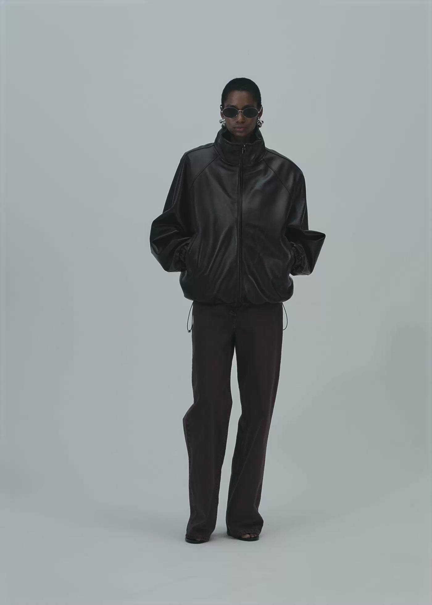 A classic oversized bomber jacket shape with an elasticized hemline to give modernity, and a zip up front closure.