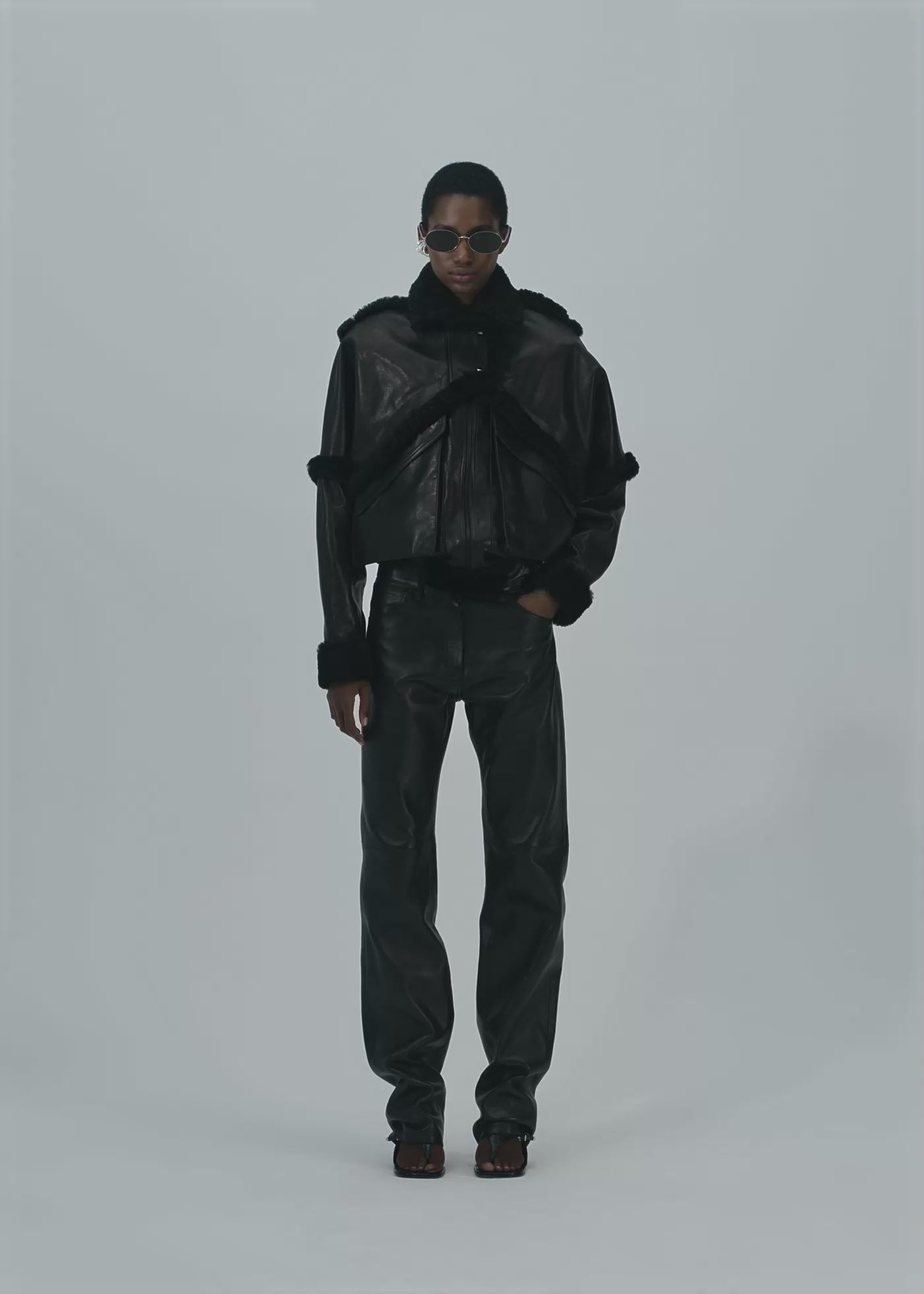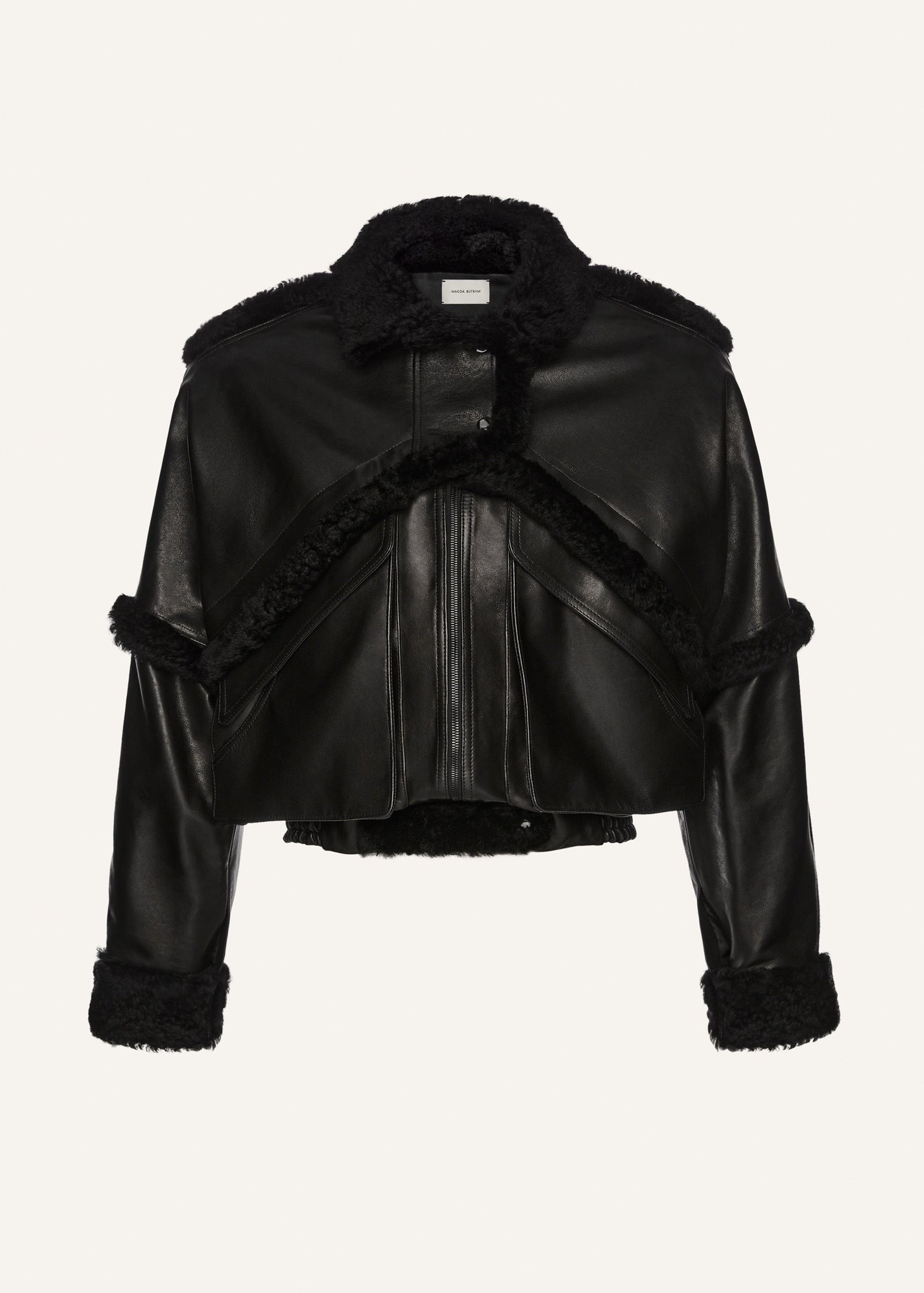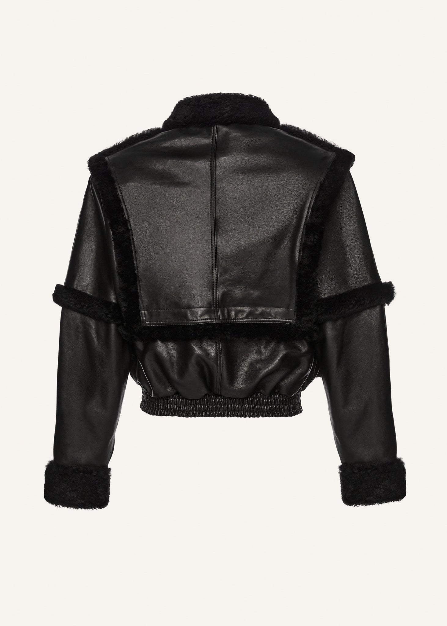 A classic bomber jacket with exposed shearling finishes and an elastic waistband.