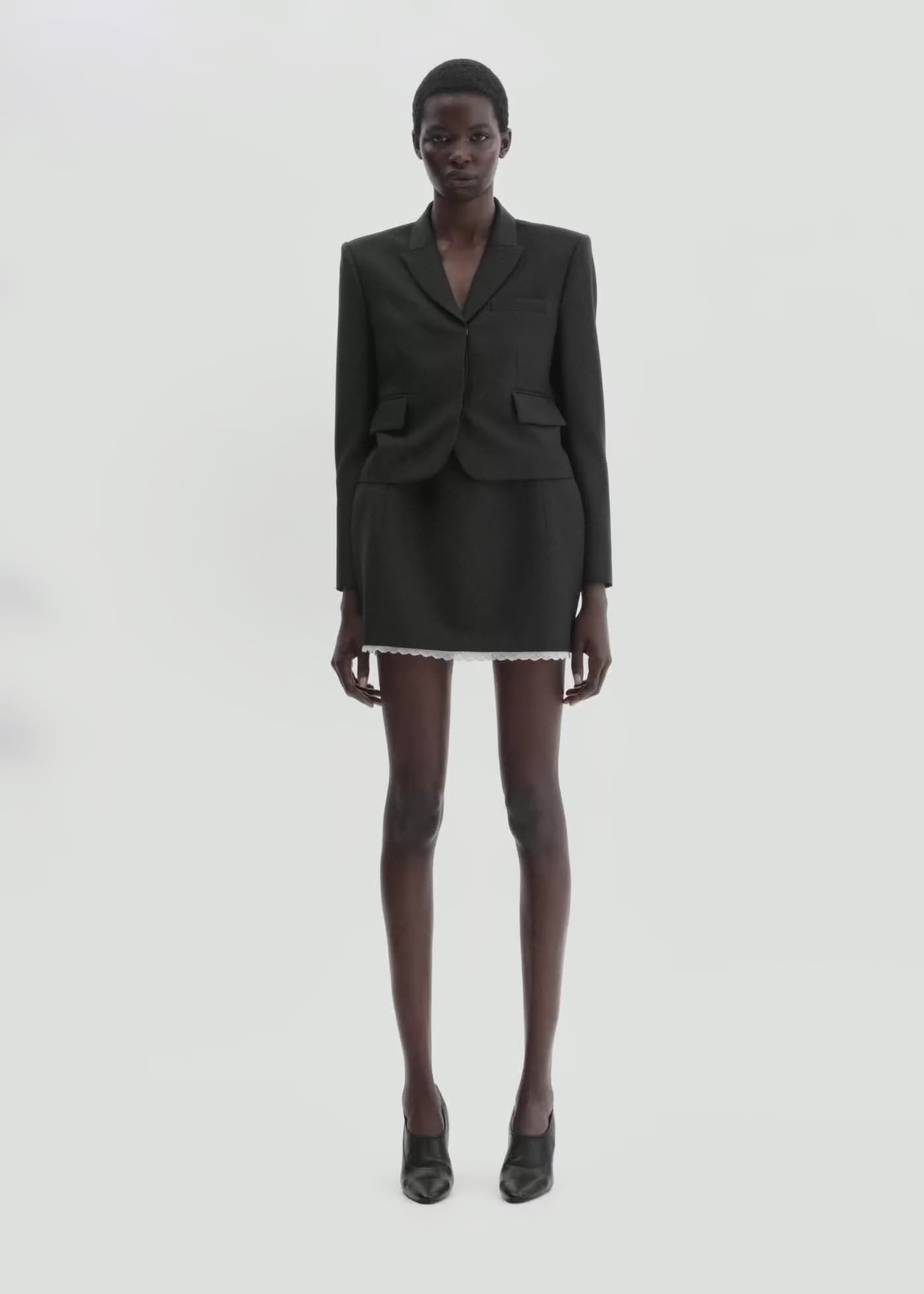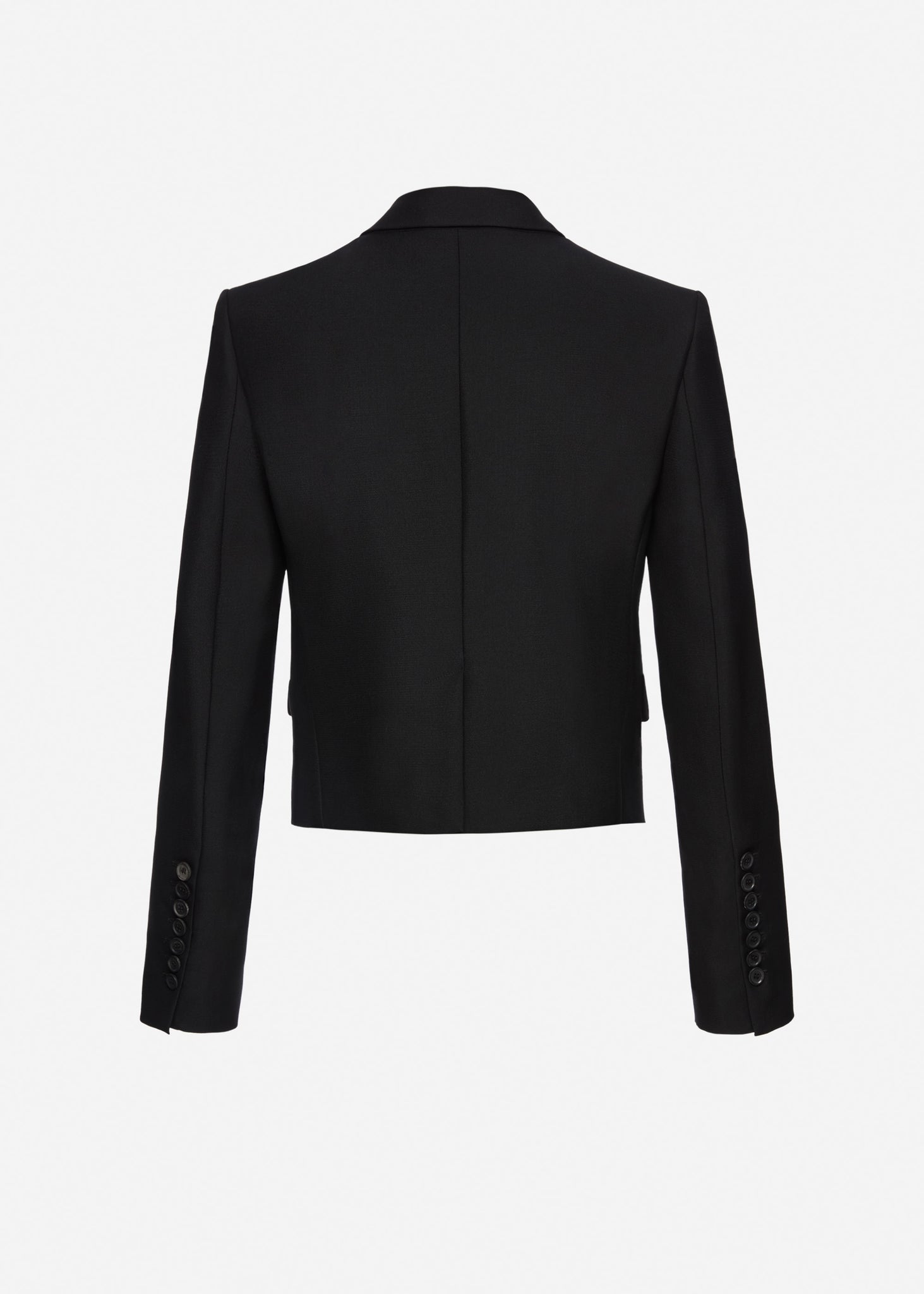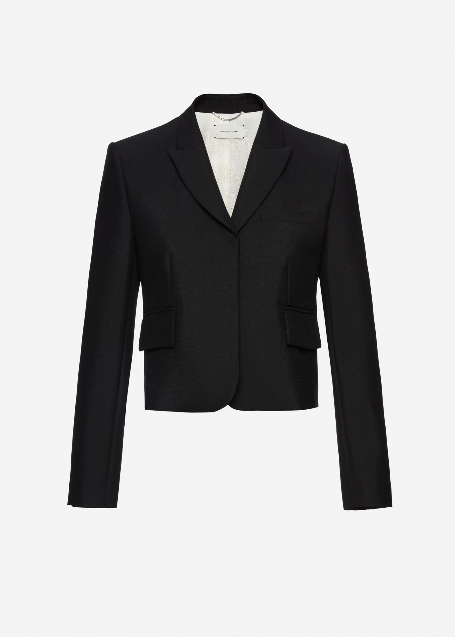 A tailored, cropped blazer with a close fit, crafted from a refined blend of wool and mohair. Designed with a closed lapel and a single-breasted front that fastens with two buttons and an interior hook. Finished with a welt chest pocket, flap pockets at the waist, and sleeve vents with seven buttons. A short back vent and a full lining with delicate embroidery complete the piece.