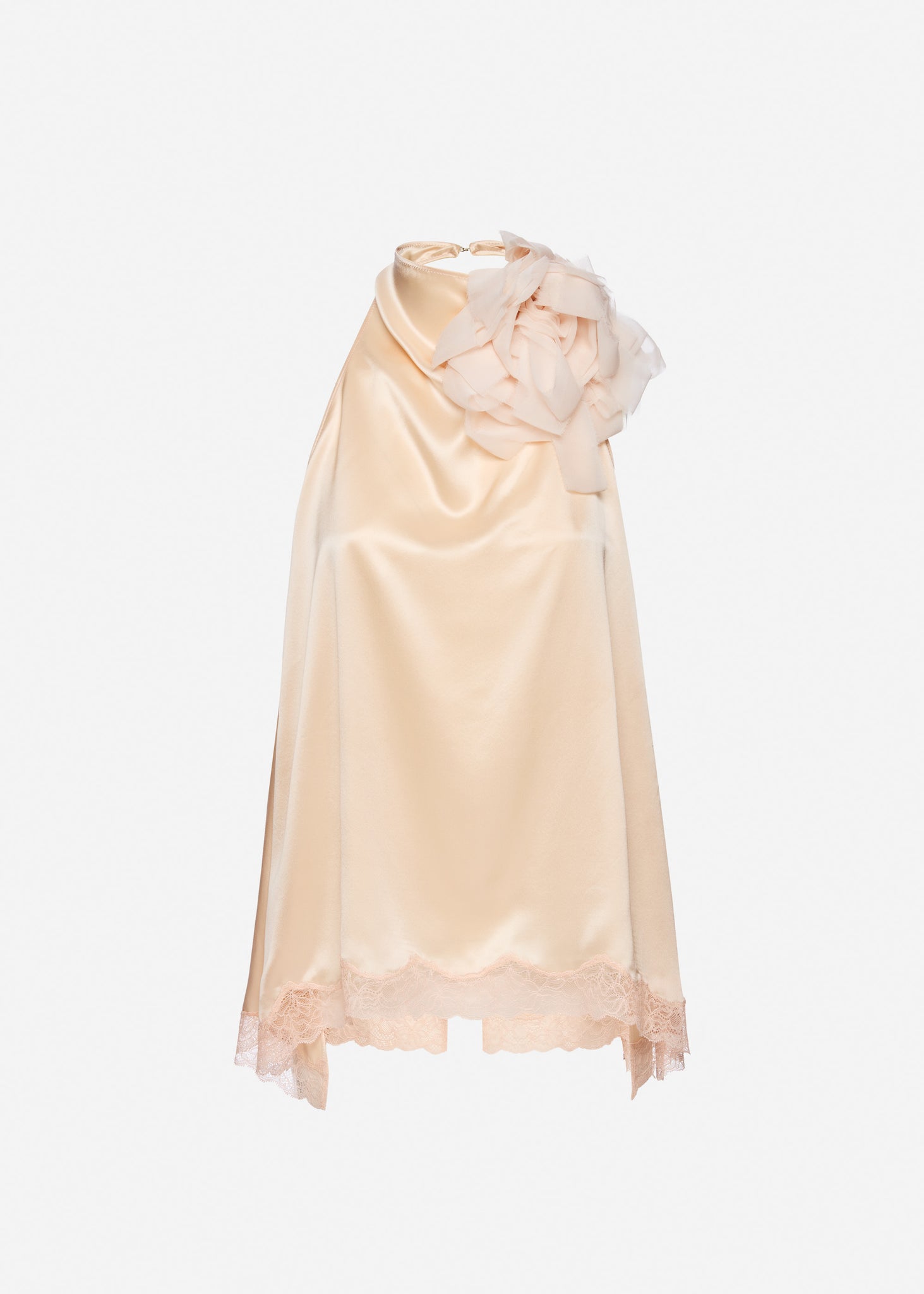 A fluid silk blouse with a high neckline that fastens at the back with a delicate hook. The open back is tied with long flowing sashes for an elegant draped effect. Finished with side slits and a scalloped lace trim along the hem. Comes with a detachable flower brooch for optional embellishment.