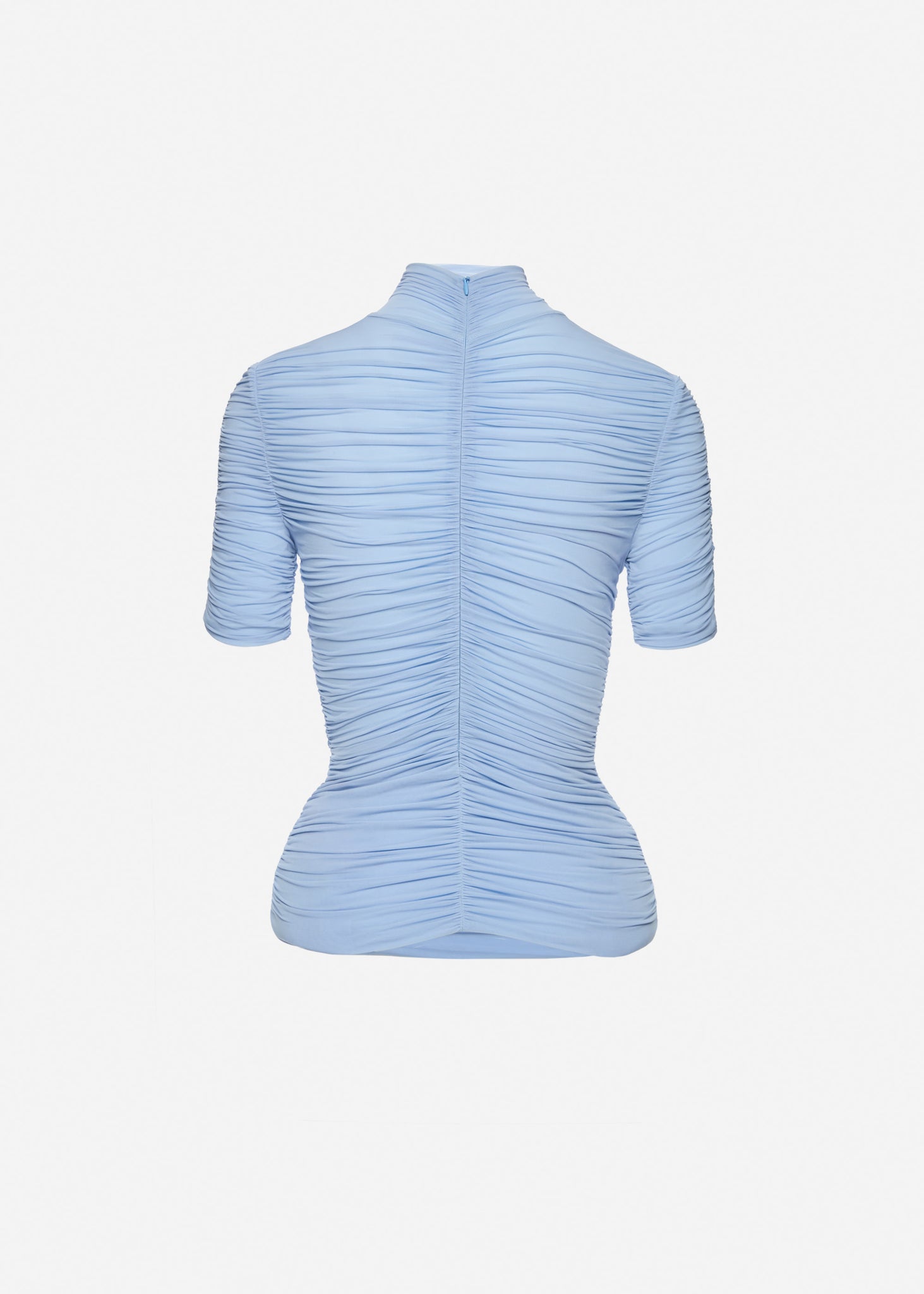 A fitted hip-length blouse crafted from a stretch cupro blend. Designed with a high ruched neckline and short gathered sleeves, it features diagonal front seams and softly draped ruching throughout the body. A sculptural flower detail is attached at the neck, while subtle padding enhances the hips for a feminine silhouette. Finished with a concealed zip closure at the back.