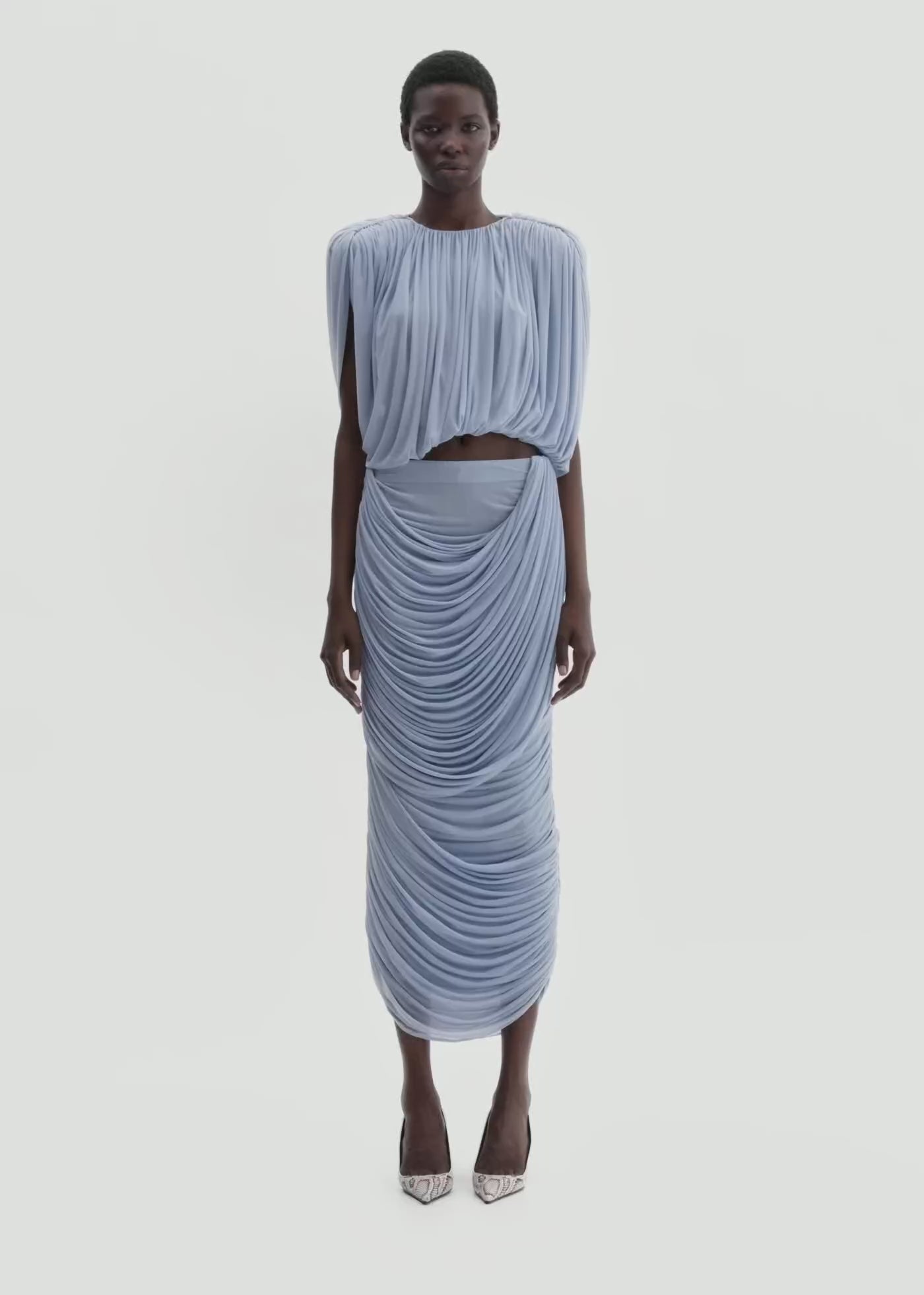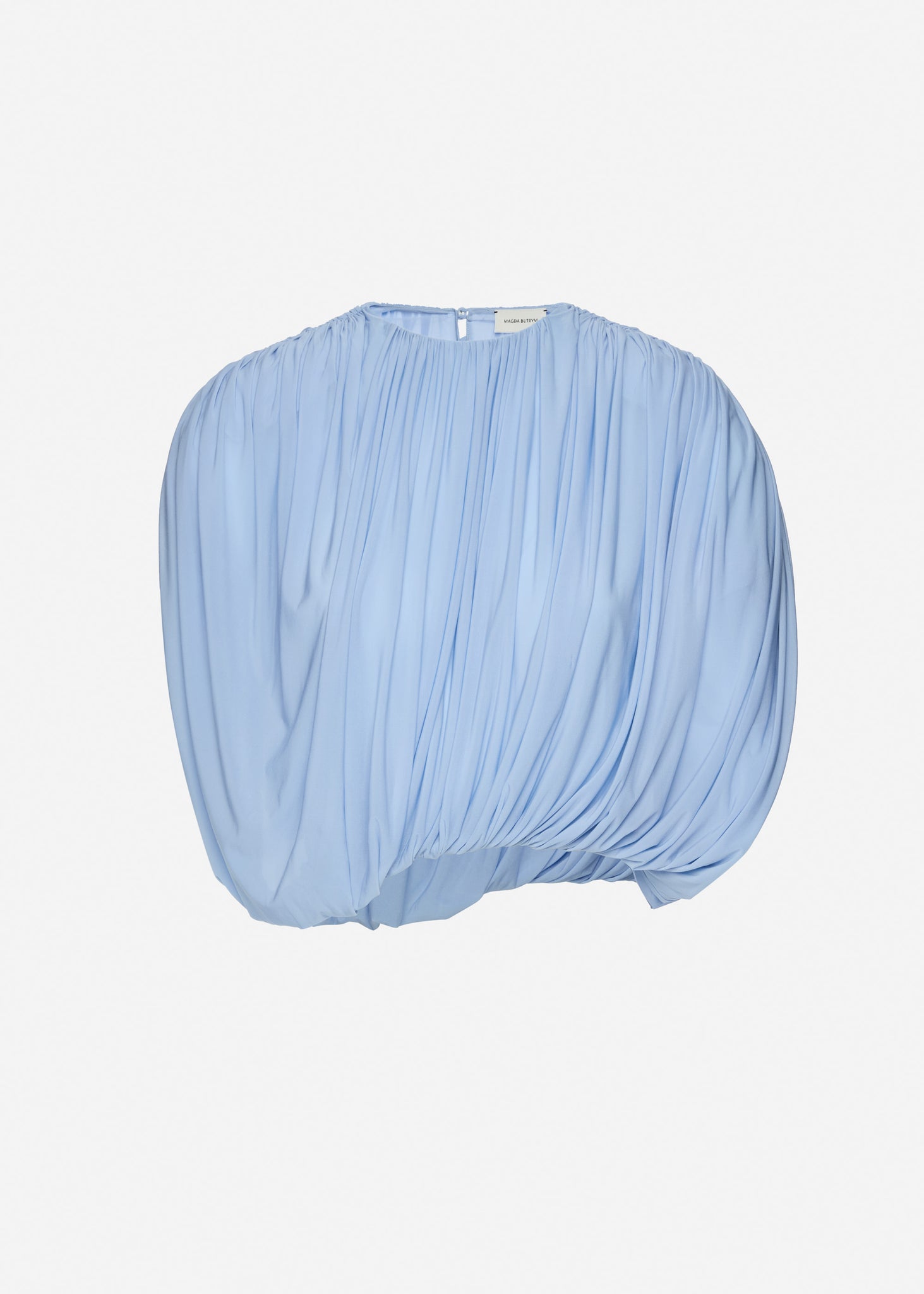 A sculptural sleeveless blouse crafted from a soft cupro blend with added stretch. The design features a rounded neckline, voluminous draping gathered at the top and hem, and a smooth inner lining that balances its airy structure. Light shoulder padding adds definition to the silhouette, while the elasticated hem creates a subtle bubble effect. Fastens at the back with three covered buttons and loop closures.