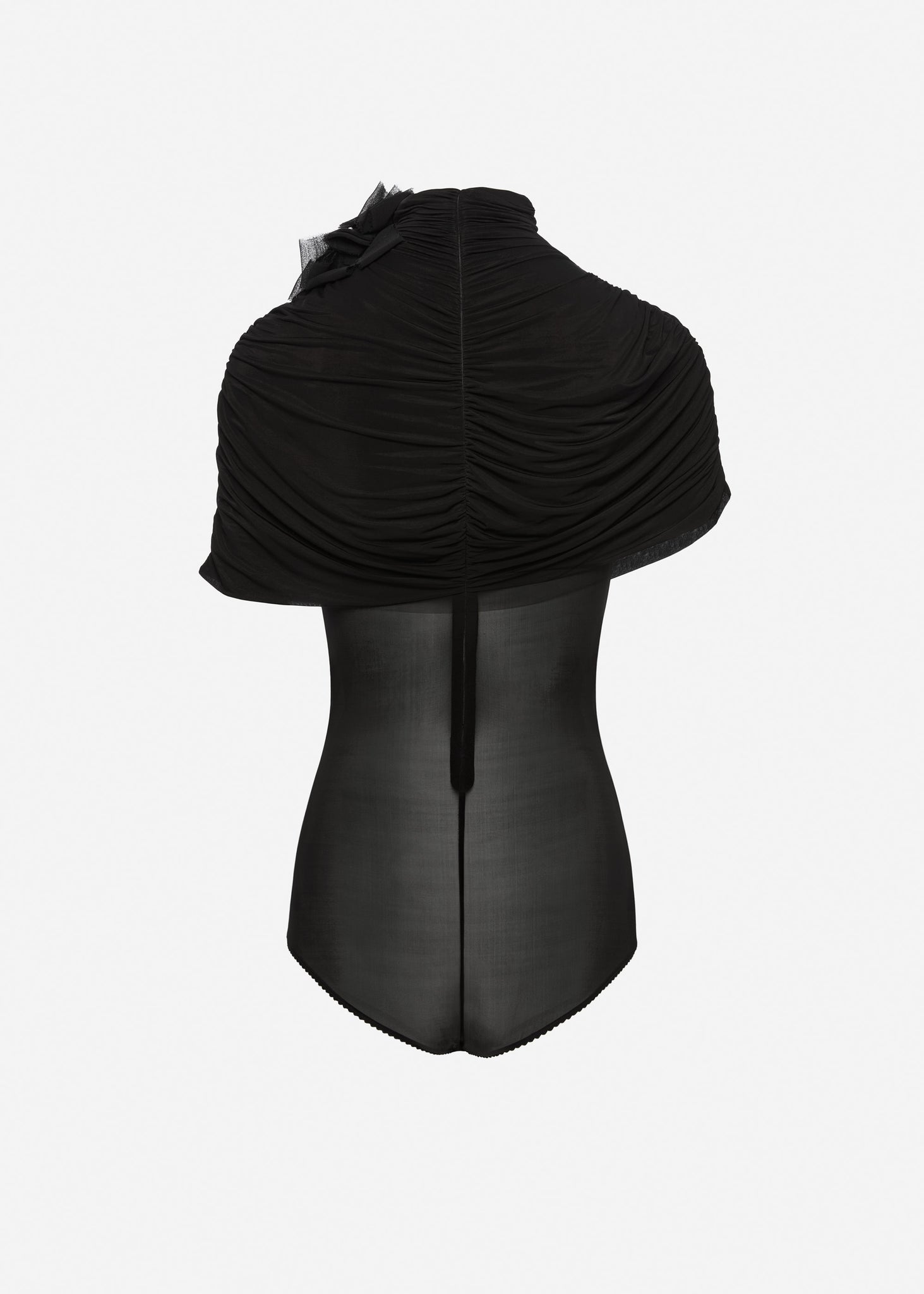 A sculptural bodysuit crafted from a soft cupro blend with stretch for a smooth, second-skin fit. The design features a ruched high collar and a delicate cape overlay that drapes across the shoulders, creating fluid volume. Fastens at the back with a concealed zip and with press studs at the crotch. Comes with a detachable flower brooch for styling versatility.