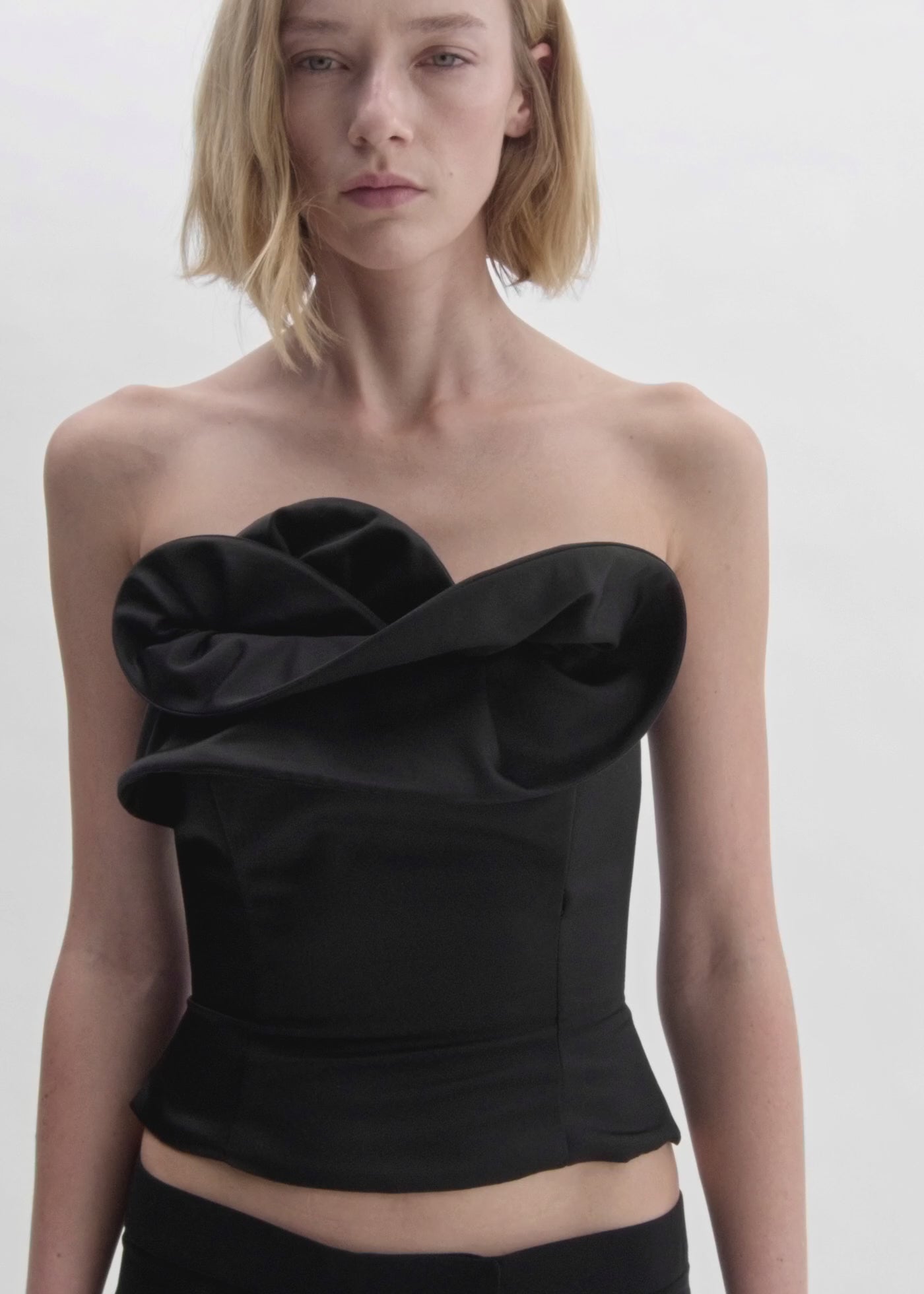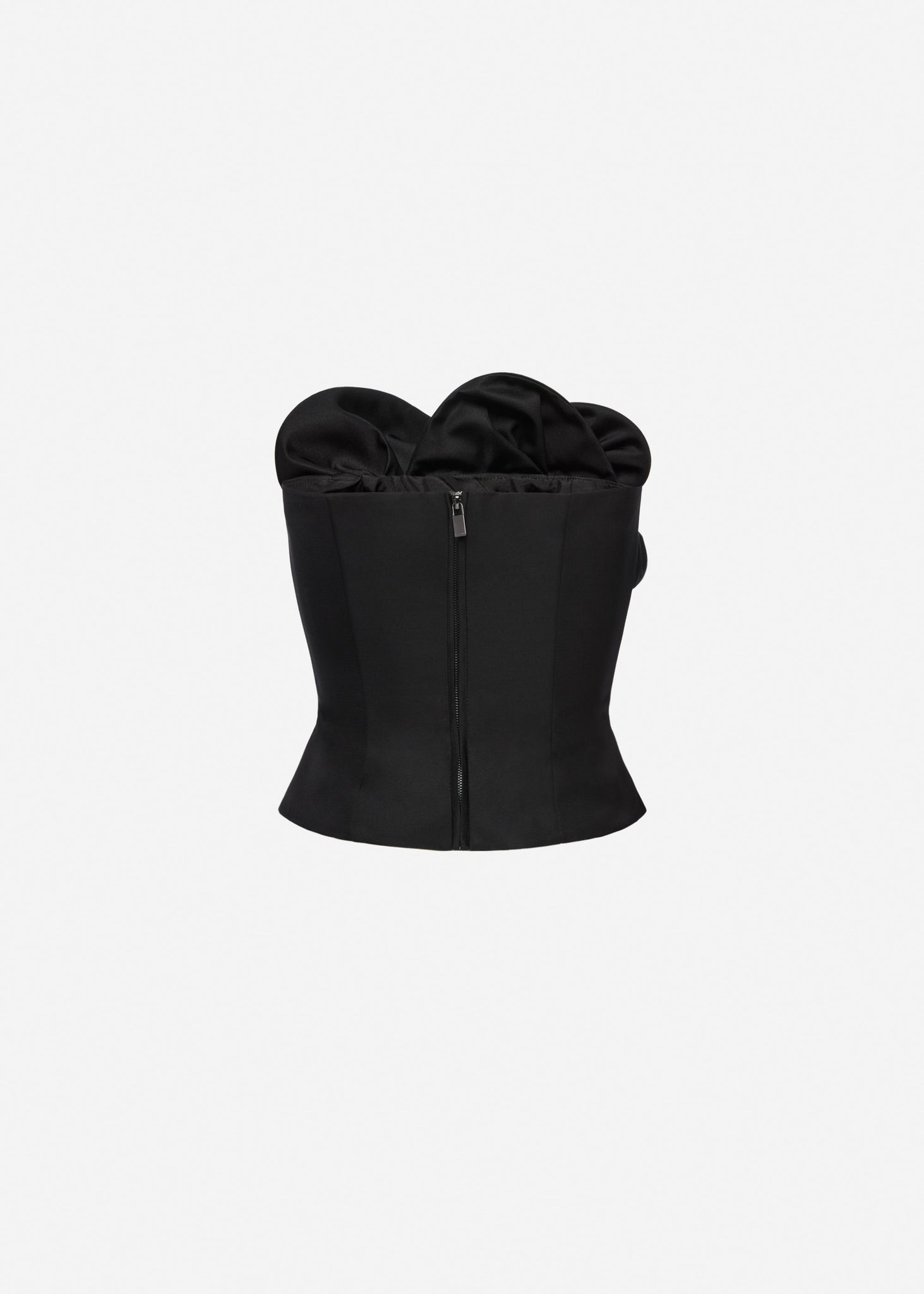 A structured corset crafted from a luxurious blend of wool and silk. Designed with internal boning along the seams for sculpted support and a fitted silhouette. The front is adorned with an intricate petal-like overlay shaped to resemble a blooming rose. Finished with a metal zip closure at the back and a full silk lining.