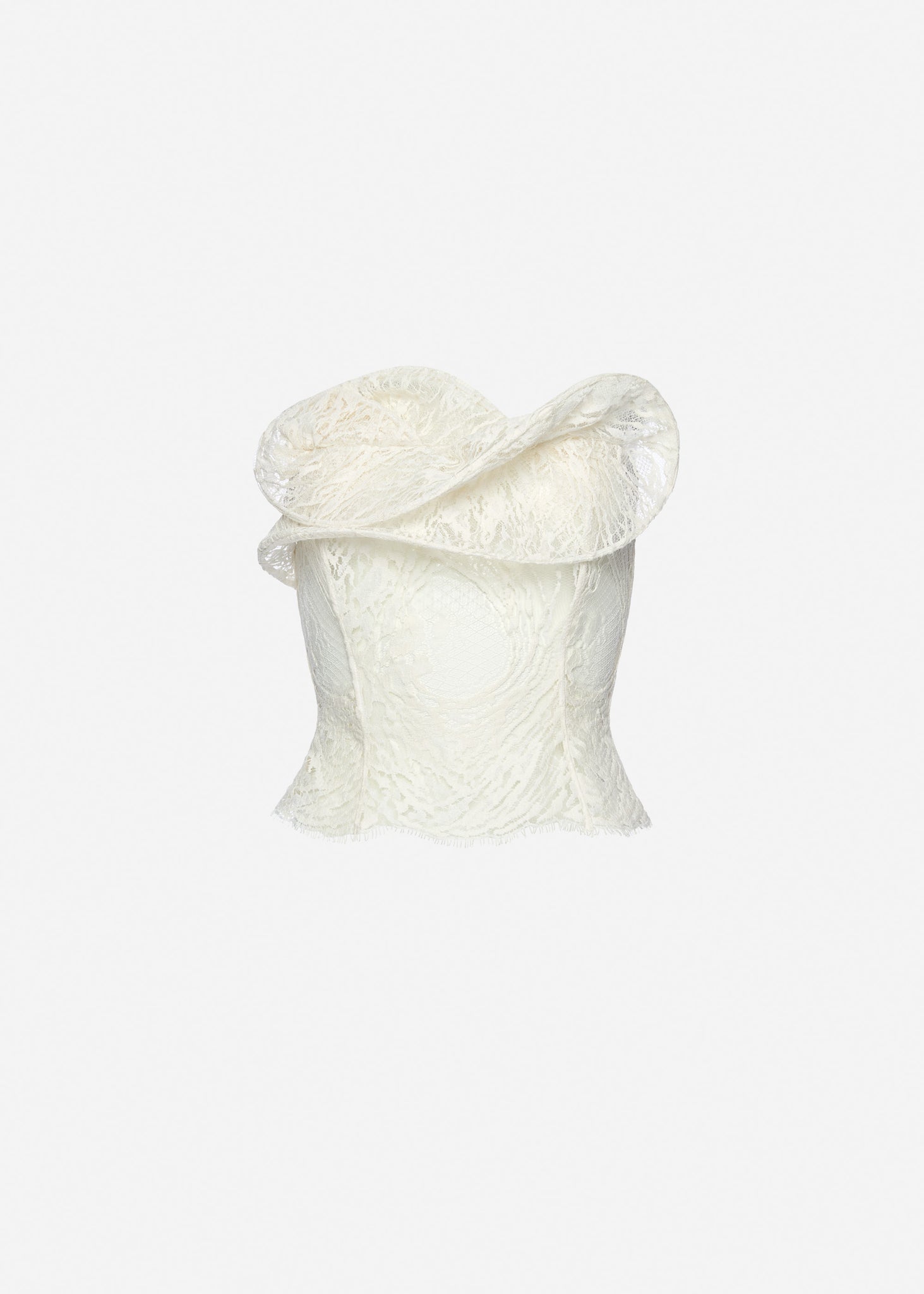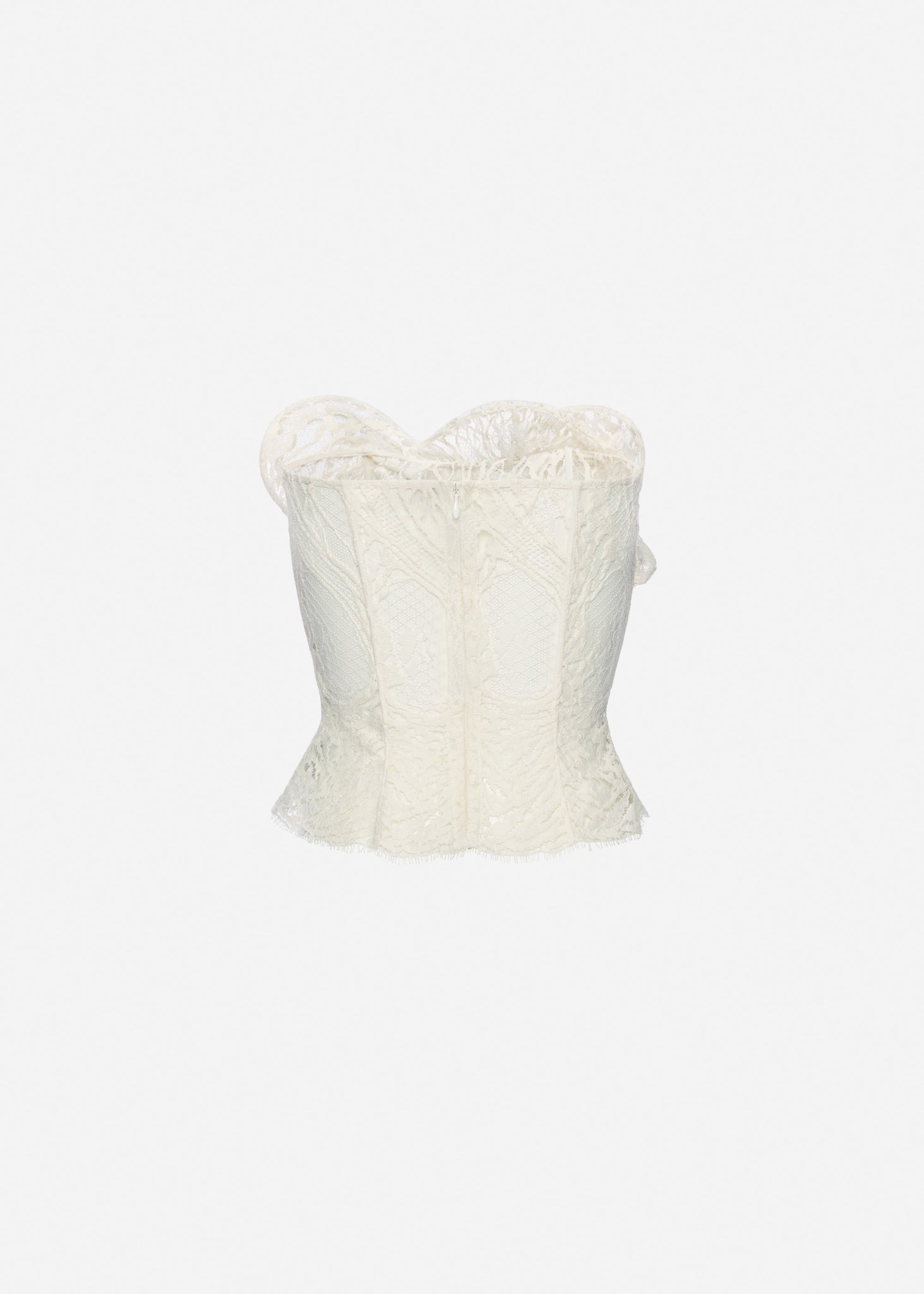 A structured corset crafted from cotton blend lace. Designed with internal boning along the seams for sculpted support and a fitted silhouette. The front is adorned with an intricate petal-like overlay shaped to resemble a blooming rose. Finished with a metal zip closure at the back and a full silk lining.