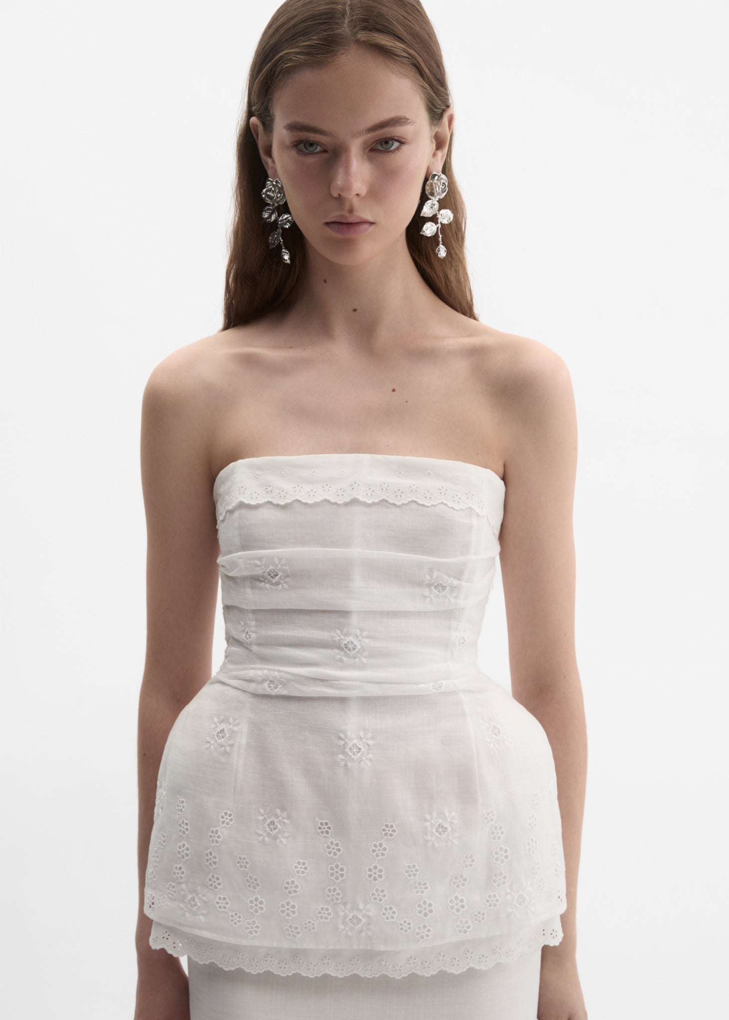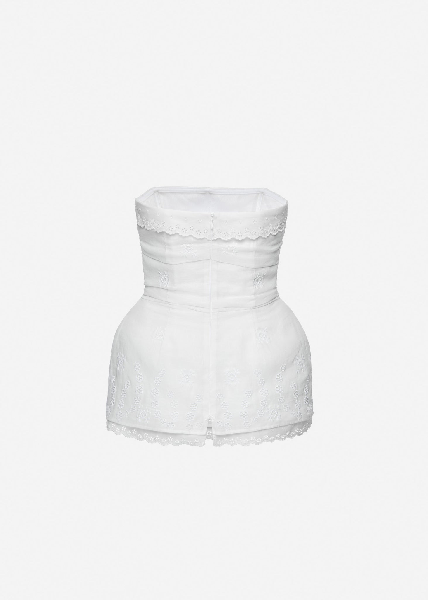 A corset crafted from embroidered cotton and linen fabric, detailed with delicate lace along the neckline and hem. The interior features a mesh corset base with hook closures for structured support. Designed to accentuate the waist and softly structure the hips with light padding. Closes at the back with a concealed separating zip. The lower edge of the lining is finished with visible decorative lace for a romantic touch.