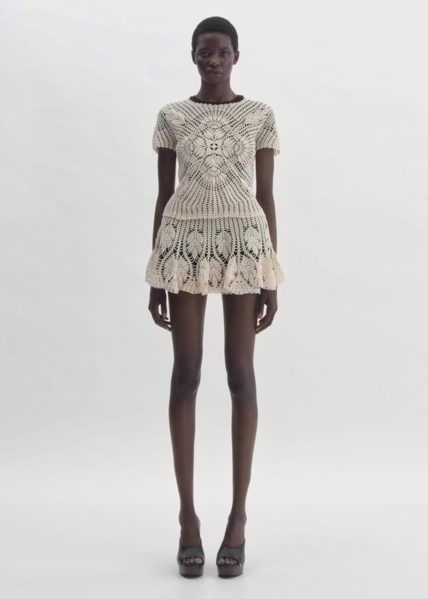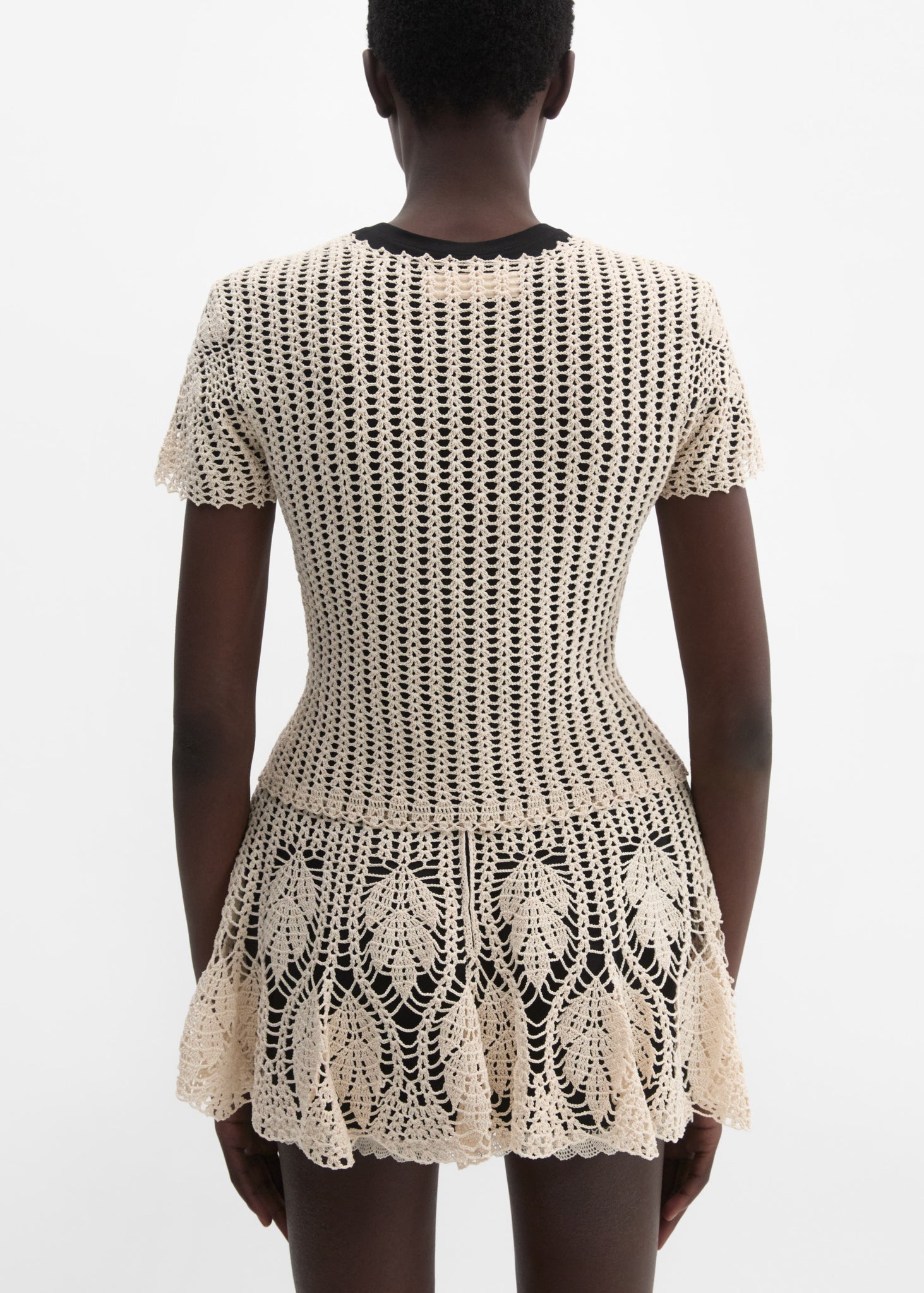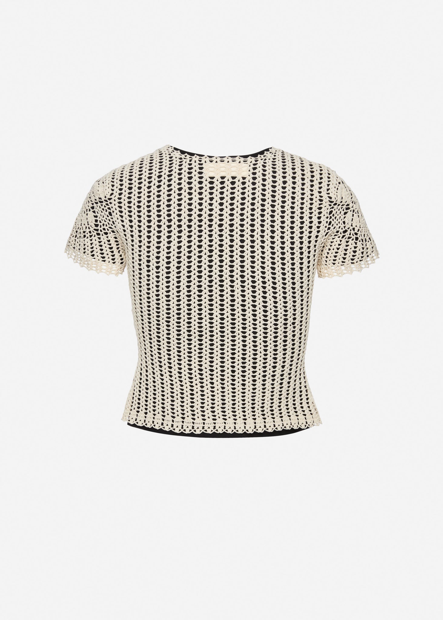 A two-piece set combining a hand-crocheted cotton top with a contrasting viscose jersey underlayer. The crochet layer features short sleeves, a round neckline, and intricate openwork detailing that creates a delicate, lace-like effect. The inner jersey top provides coverage and comfort while allowing the crochet pattern to stand out. The two pieces are designed to be worn together or separately.