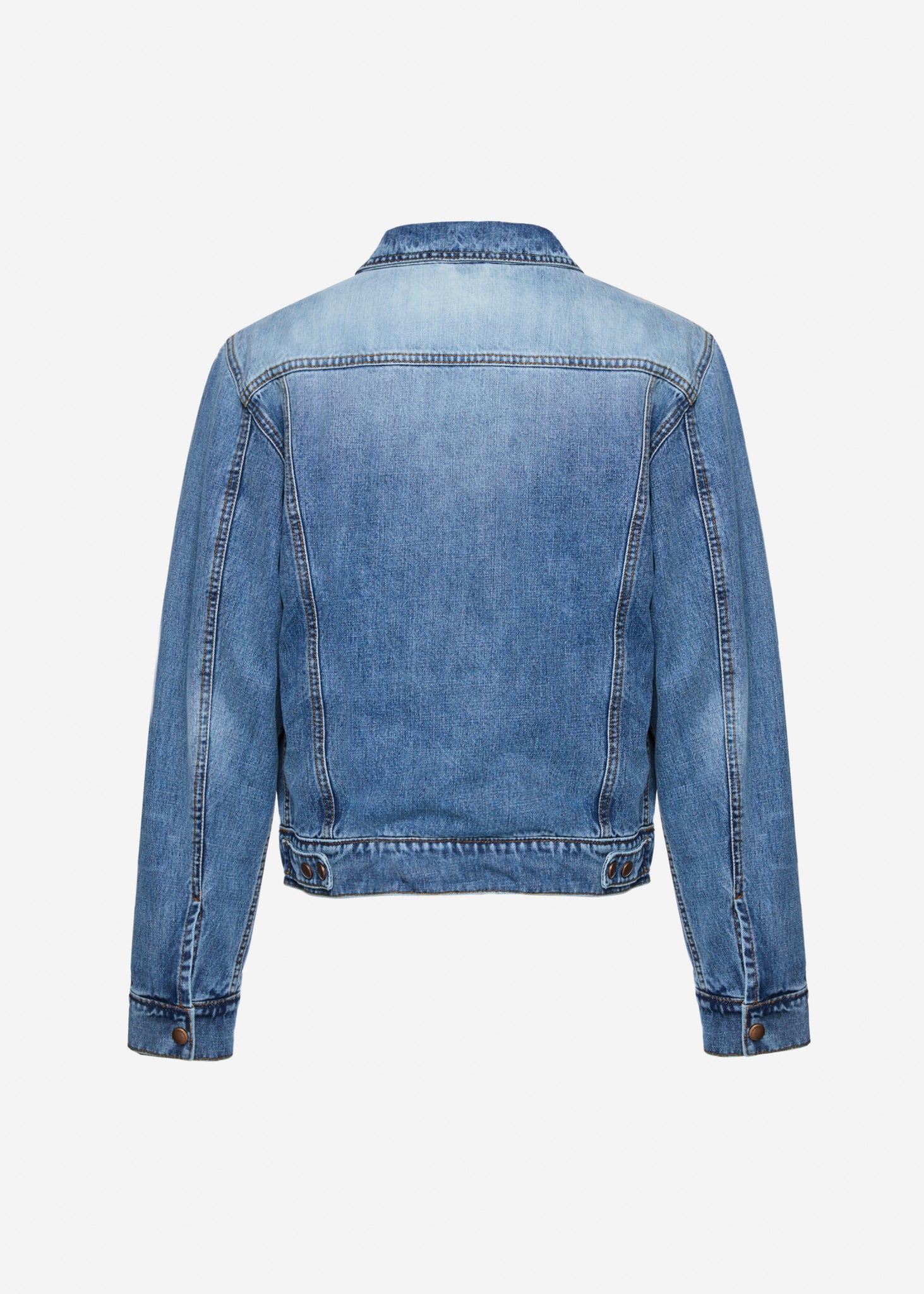 A classic denim jacket reimagined with a warm lining. Crafted from mid-weight dark blue denim with a vintage fade, it features a pointed collar, buttoned flap chest pockets, and side welt pockets. The structured fit and adjustable hem tabs enhance its timeless appeal.