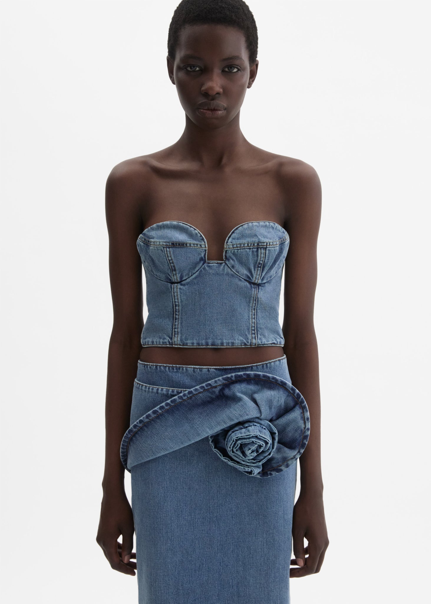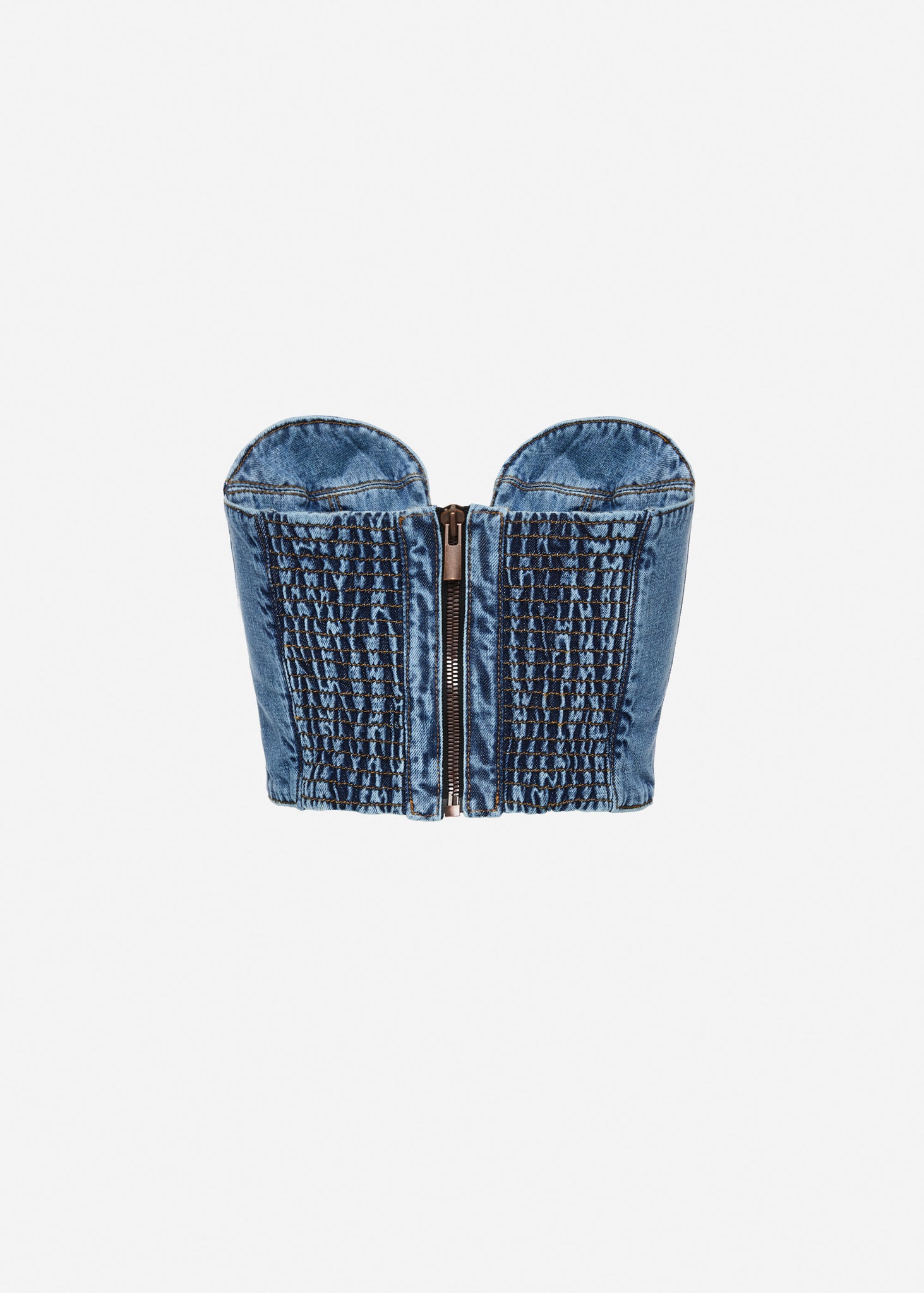A bustier top featuring a sweetheart neckline. The fitted silhouette is shaped with structured seams that contour the body, while the back showcases elasticated smocking for comfort and a zip closure for ease.