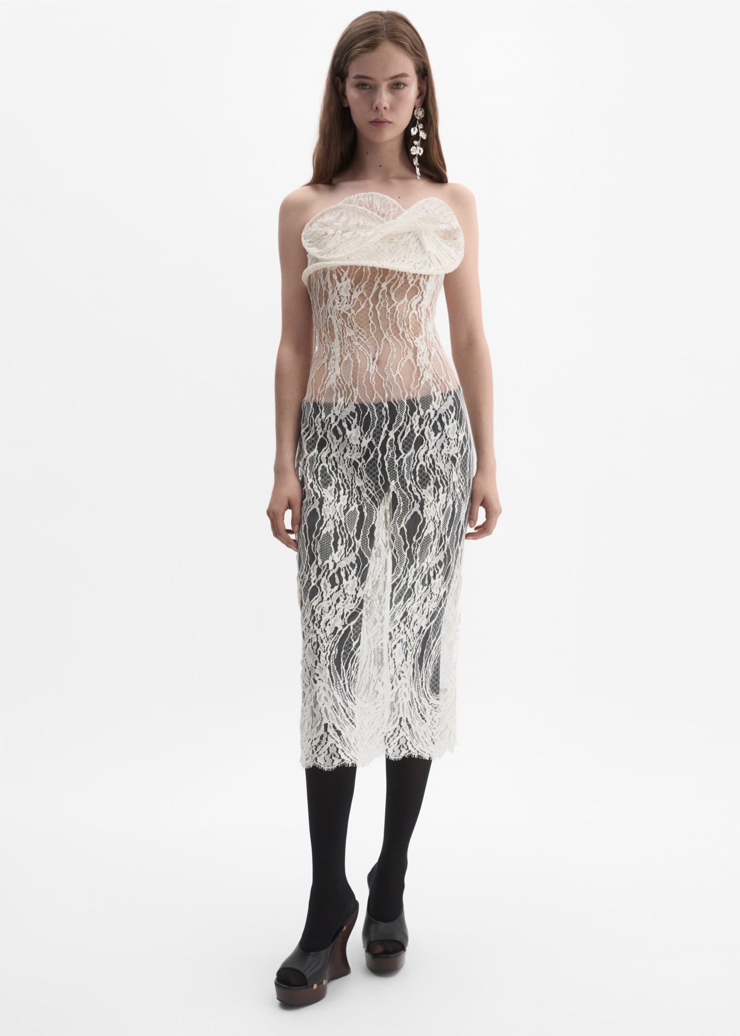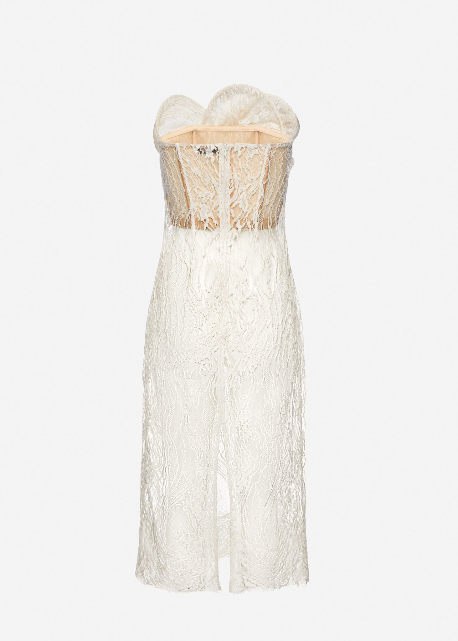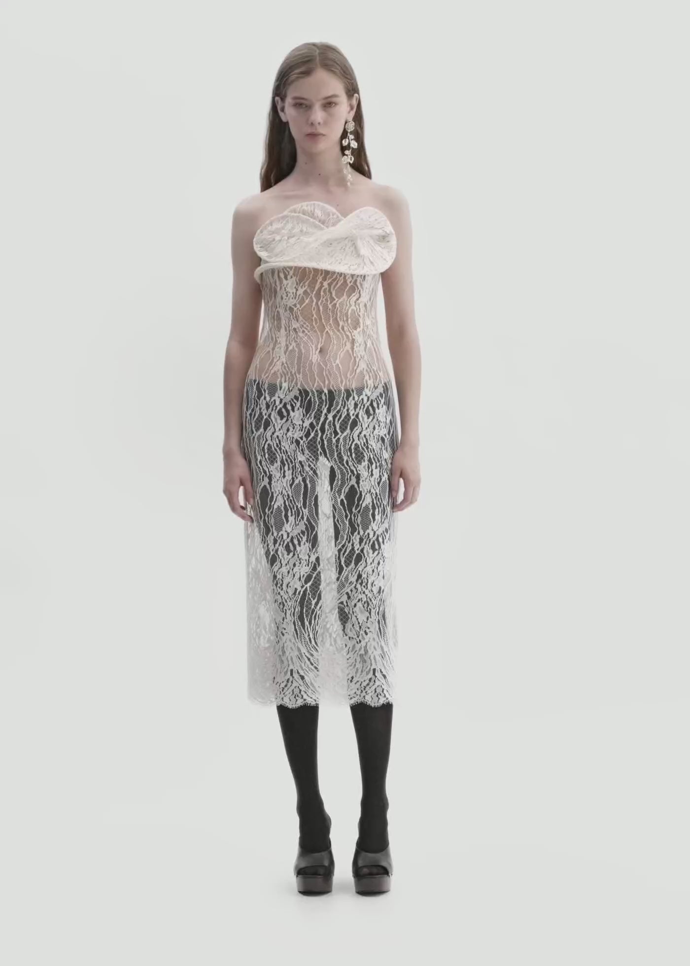 A delicate, semi-sheer lace dress falling below the knee, designed with a structured corset base in contrasting nude mesh. The front features a sculptural neckline adorned with a folded lace overlay shaped into a soft floral form. The inner corset offers support with hook-and-eye and bra closures, while the outer lace layer drapes effortlessly for a romantic finish. Secures at the center back with a concealed zipper and a subtle slit below.