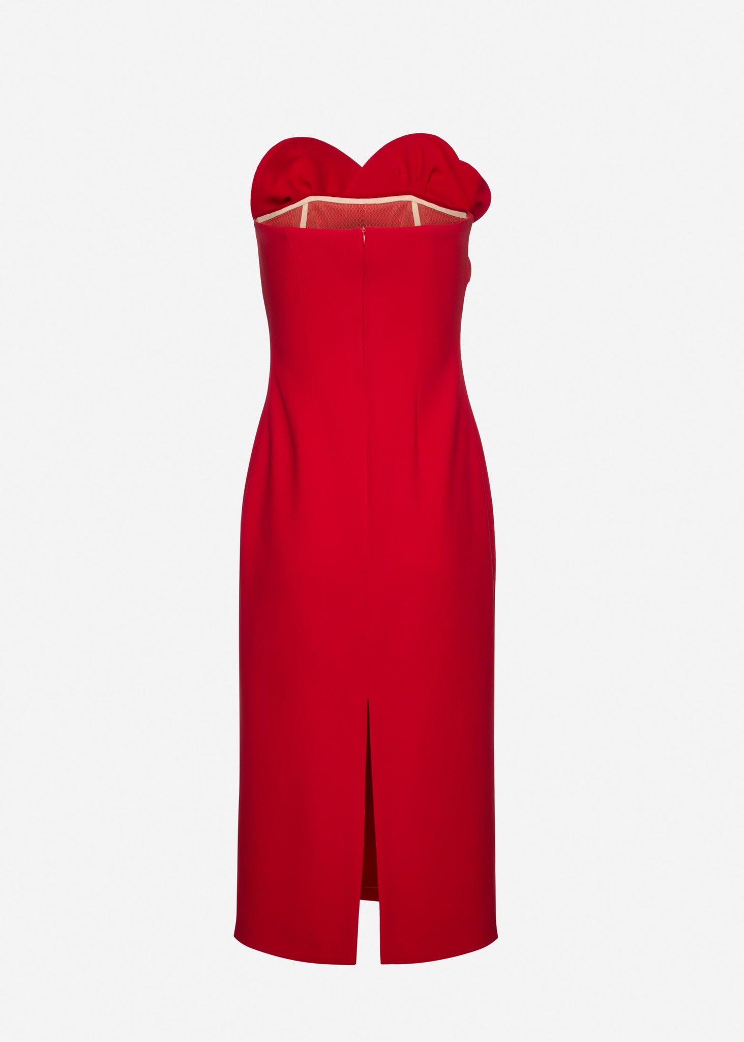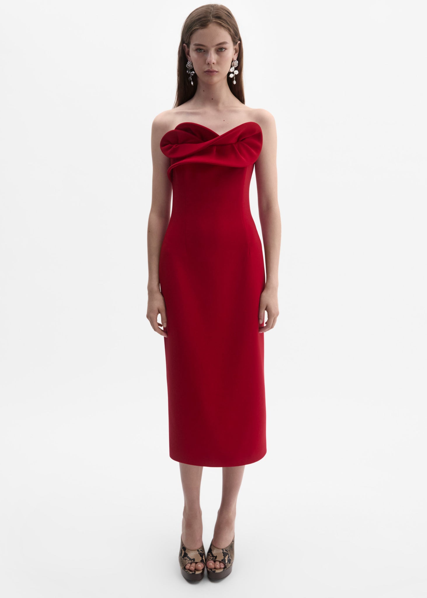 A refined below-the-knee dress crafted from wool. The silhouette is structured yet fluid, featuring a fitted bodice with an internal corset that enhances the waist and bust. The neckline is adorned with a sculptural folded overlay, shaped into a floral swirl. Closes at the center back with a concealed zipper and a delicate slit beneath for ease of movement. The inner corset secures with hook-and-eye and bra closures for a seamless finish.