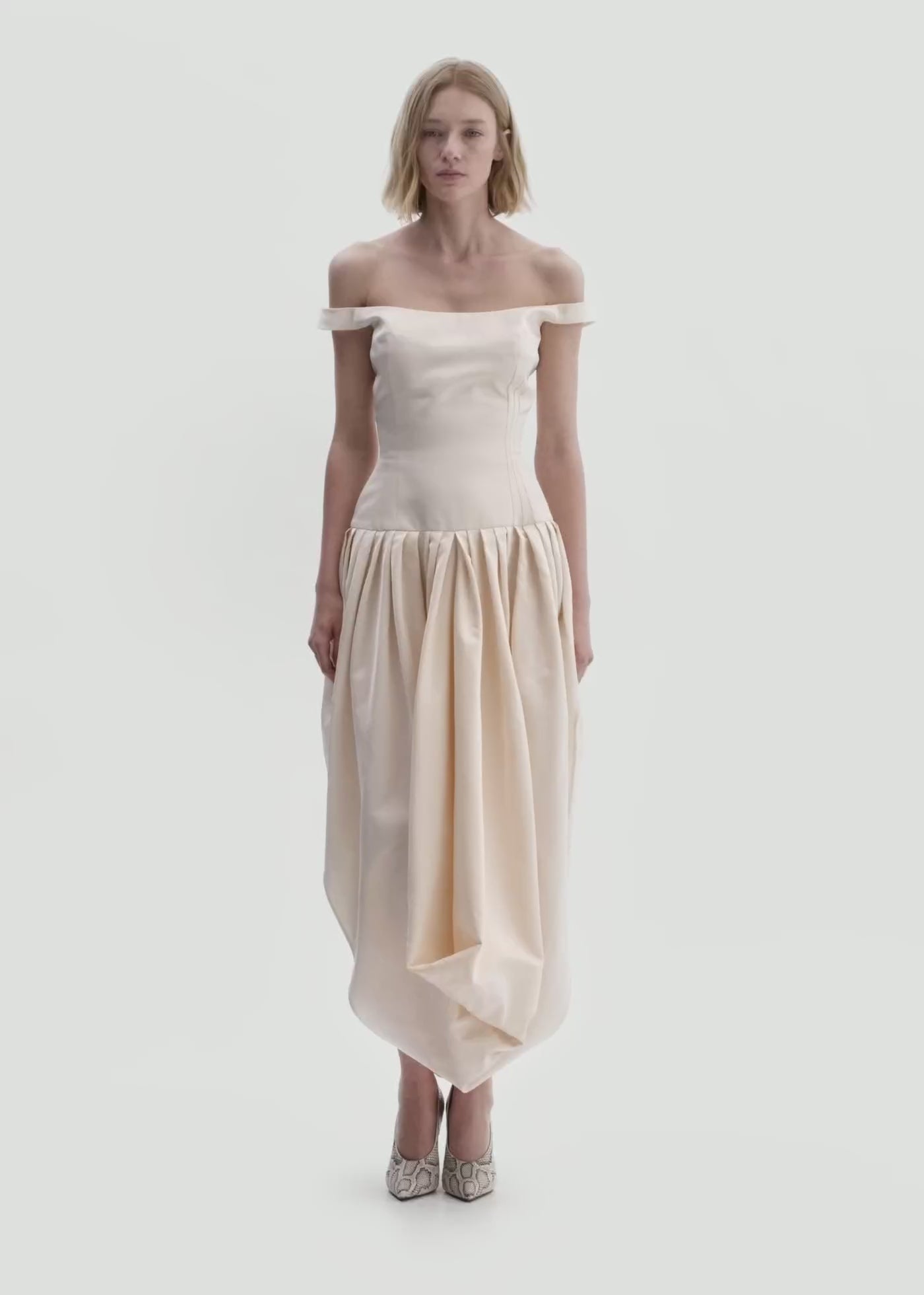 An elegant off-shoulder gown that combines a fitted bodice with sculptural draping. Crafted from cotton and silk. The upper silhouette is precisely tailored with contouring darts to accentuate the waist, while the wide neckline softly frames the shoulders. Below the hips, the voluminous skirt unfolds in asymmetric pleats and rounded side drapes. Finished with discreet side pockets, a concealed back zip, and a fully lined bodice for structure and comfort—modern romance with timeless couture refinement.