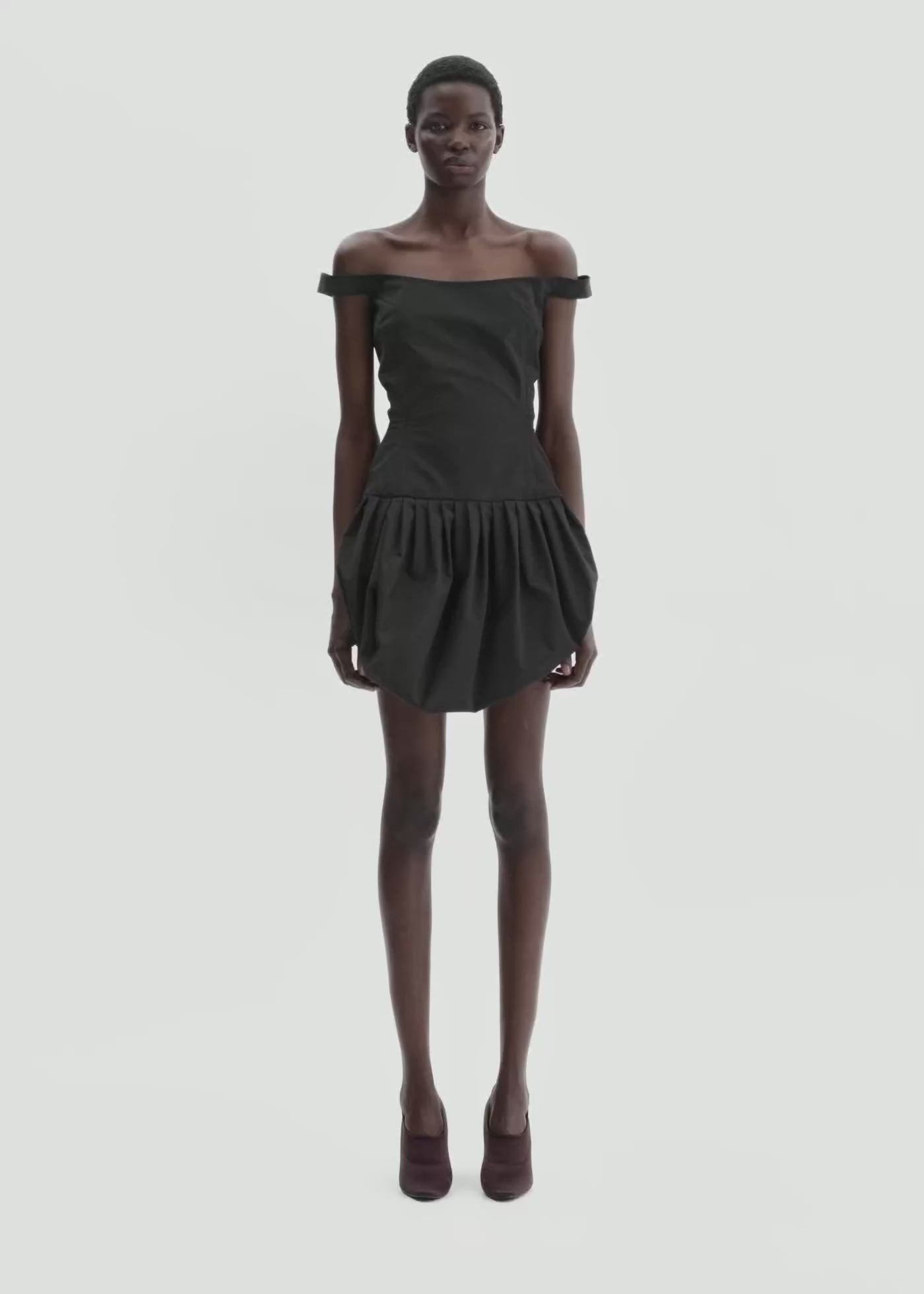 A sculptural off-shoulder mini dress that highlights Magda Butrym’s signature balance of structure and volume. The fitted bodice is shaped with precise darts to contour the waist and frame the shoulders with a wide neckline. Below, the skirt blooms into a voluminous, pleated bubble shape that curves softly at the sides. Finished with a concealed back zip and a lined bodice for a smooth, supportive fit—an elegant play on modern femininity.