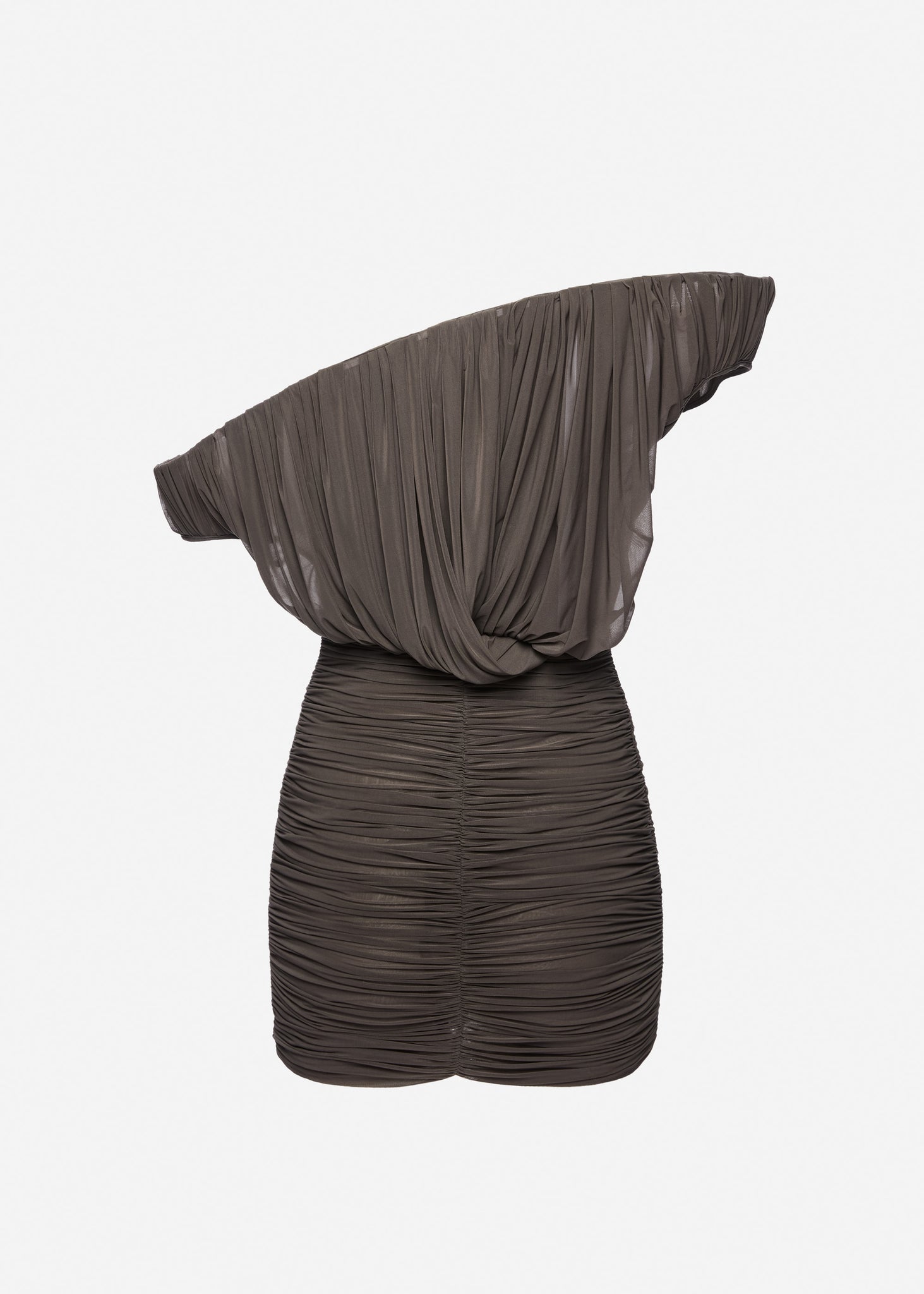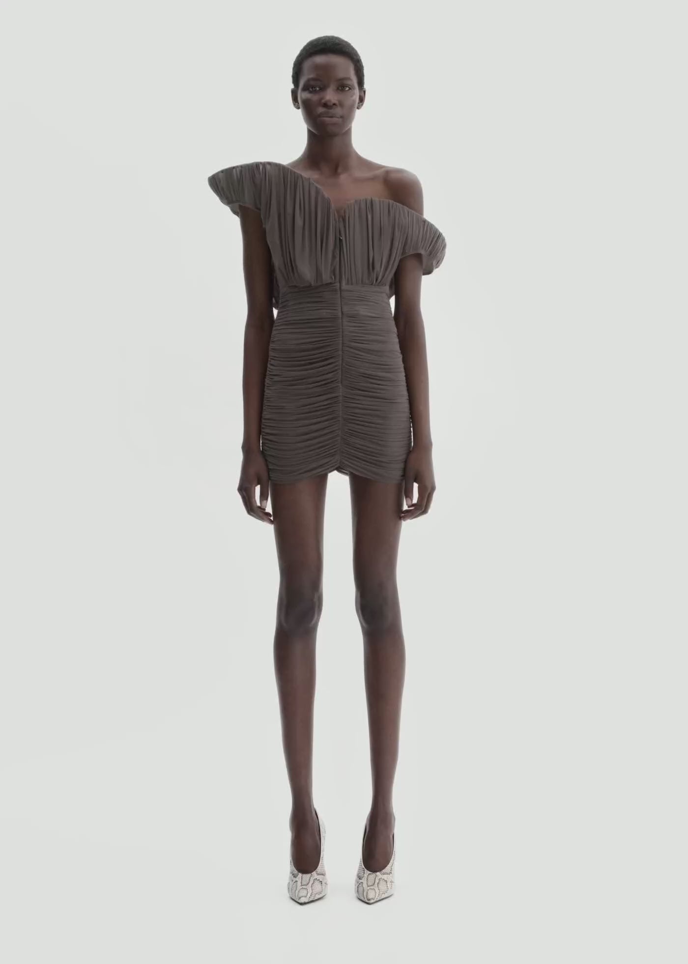 A sculptural one-shoulder mini dress featuring a dramatic fan detail shaped like a rose petal, crafted from draped jersey and reinforced with boning for structure. The fitted corset base enhances the silhouette, while rich ruching through the front, back, and sides creates soft texture and movement. Finished with a concealed side zip and internal hook-and-eye fastening for a seamless, body-hugging fit—an artful balance of sensuality and craftsmanship.
