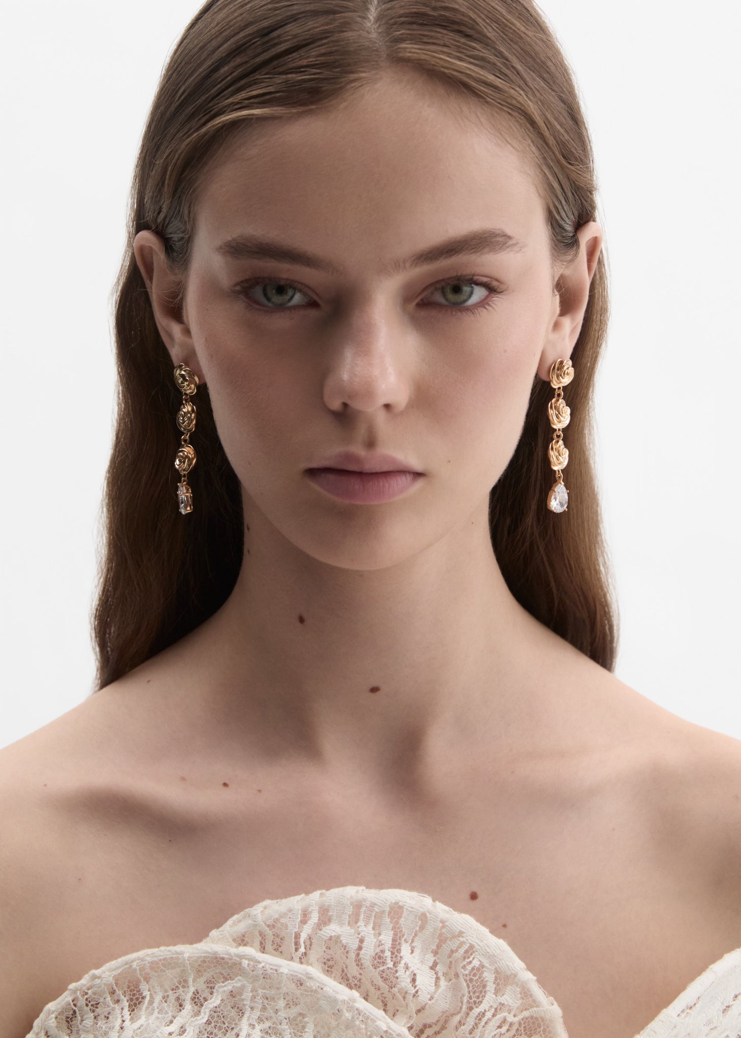 A cascading trio of sculpted roses, each linked in a fluid vertical line and finished with a teardrop-cut crystal pendant. For pierced ears.