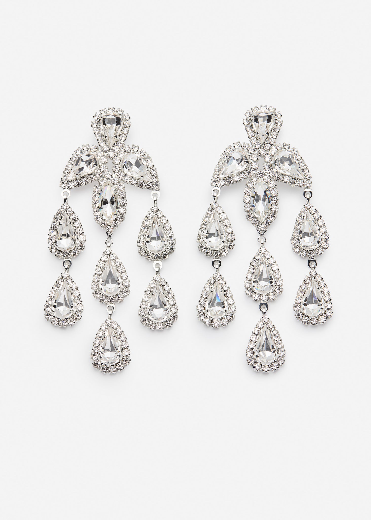 An opulent reinterpretation of the classic chandelier silhouette, these silver-tone earrings feature cascading teardrop crystals framed by pavé-set stones for an exquisite sparkle. Each faceted drop catches the light with fluid movement. For pierced ears.