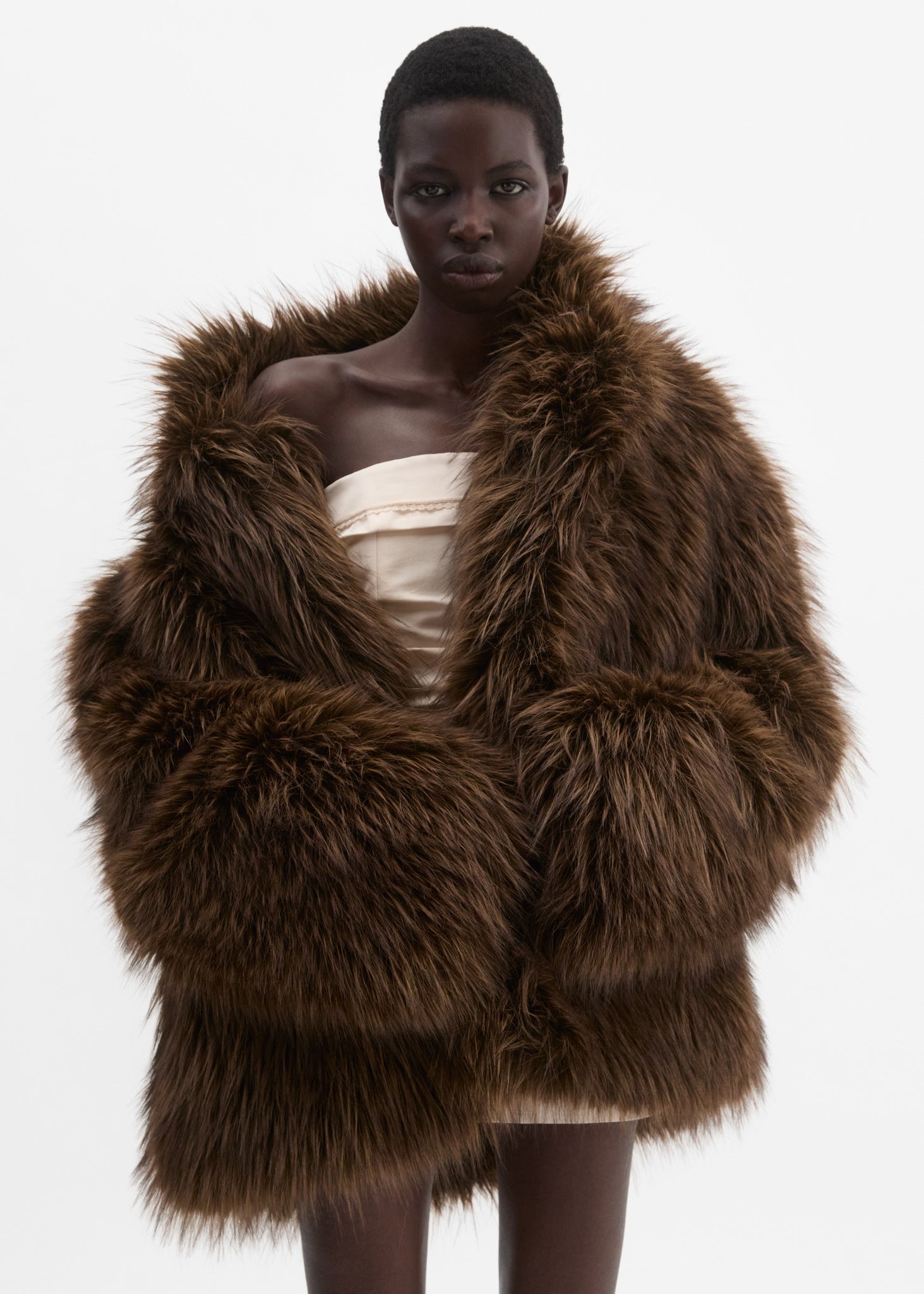 An oversized faux fur jacket with a voluminous, soft silhouette and a naturally lustrous texture. Designed with a rounded open lapel and wide collar, it fastens discreetly at the front with hooks. Side seam pockets add subtle functionality, while the interior is fully lined with contrasting embroidered fabric for a polished finish.