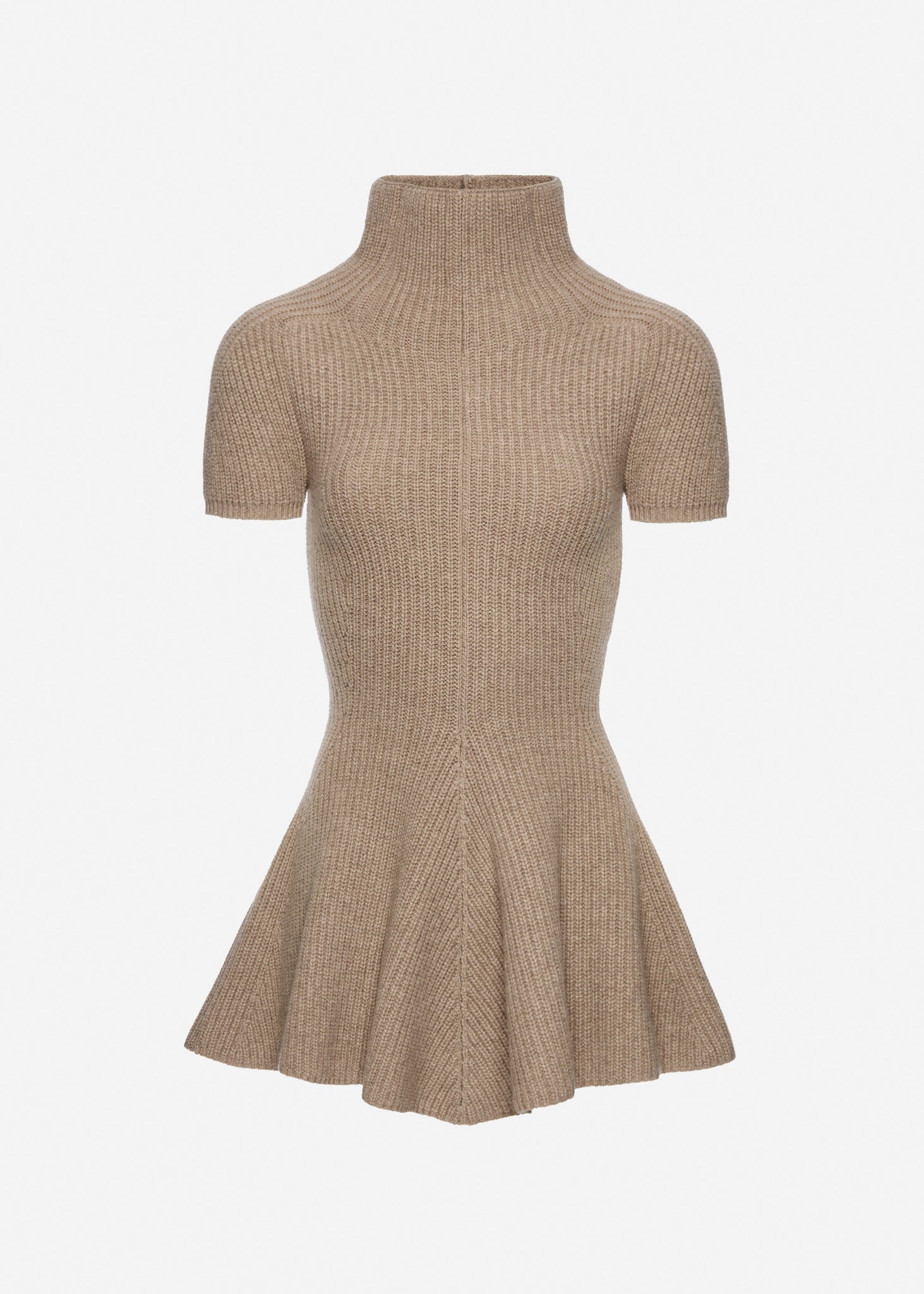 Short-sleeve flared knit dress crafted from cashmere. Features a fitted bodice with a mock neck and a gently flared hem that creates an elegant and feminine silhouette.