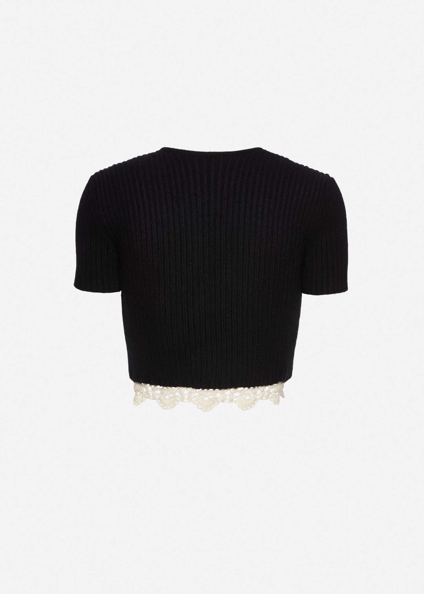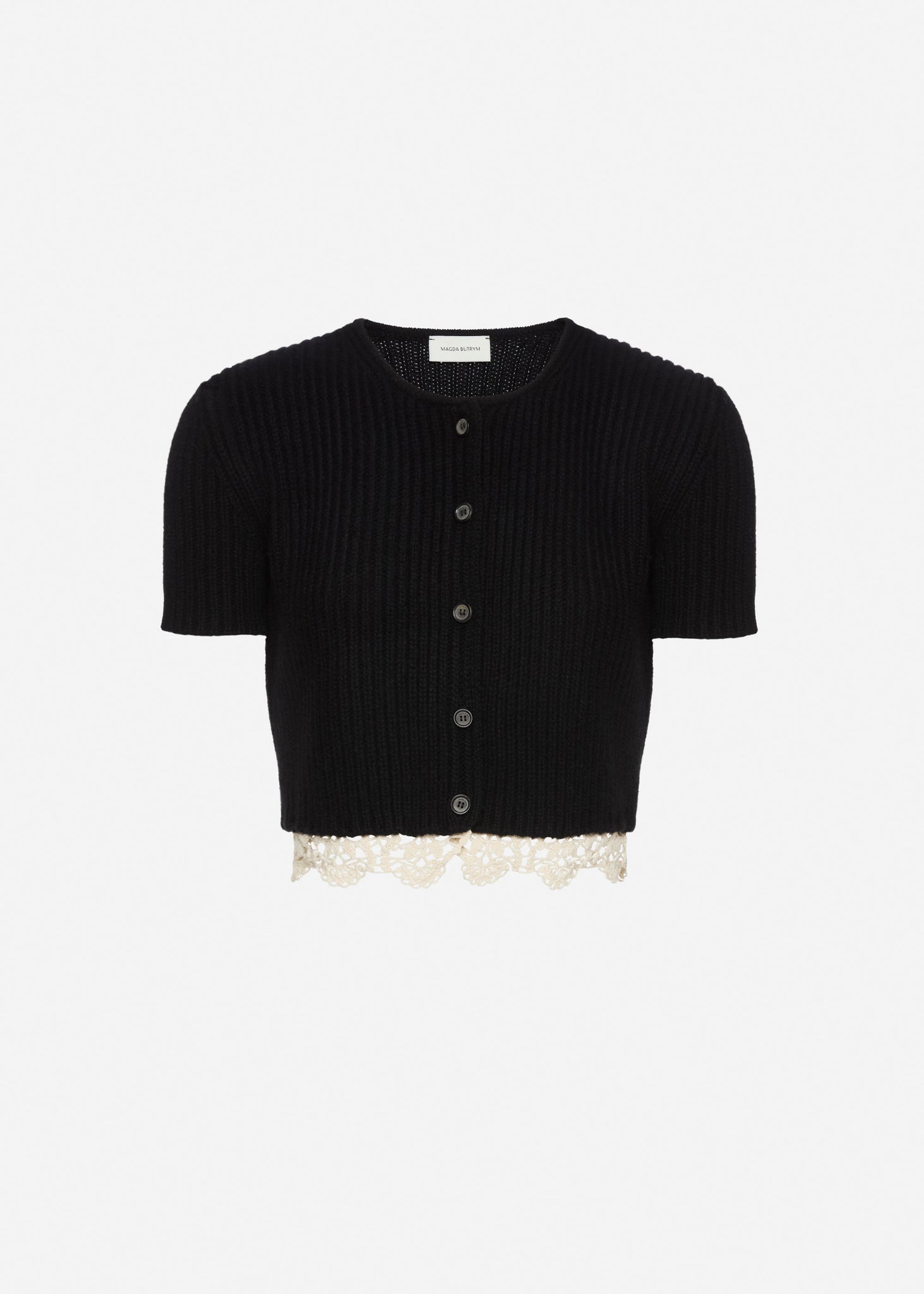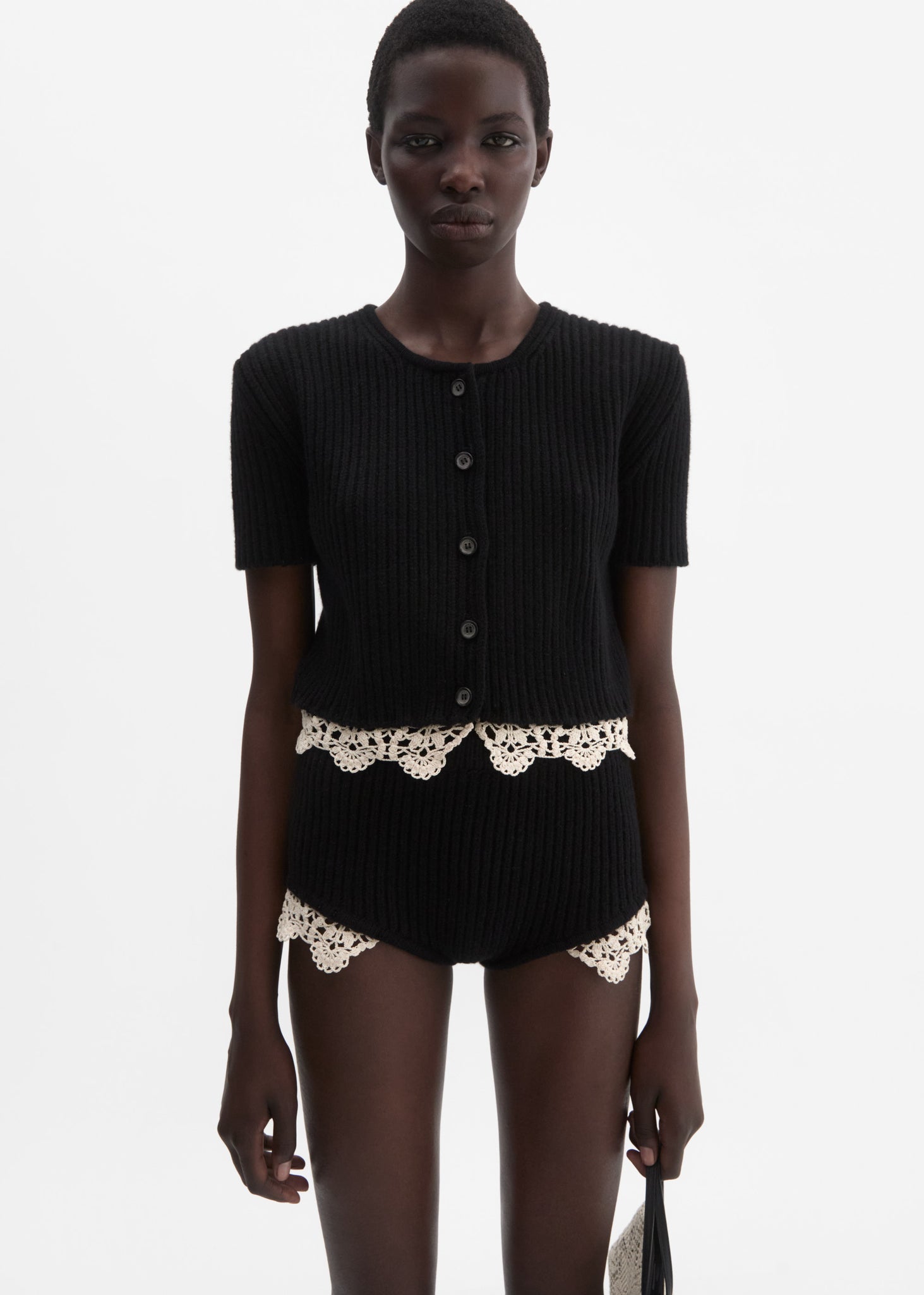 Short-sleeve cropped cardigan crafted from soft cashmere. Features a front button closure and delicate crochet lace trim along the hem.