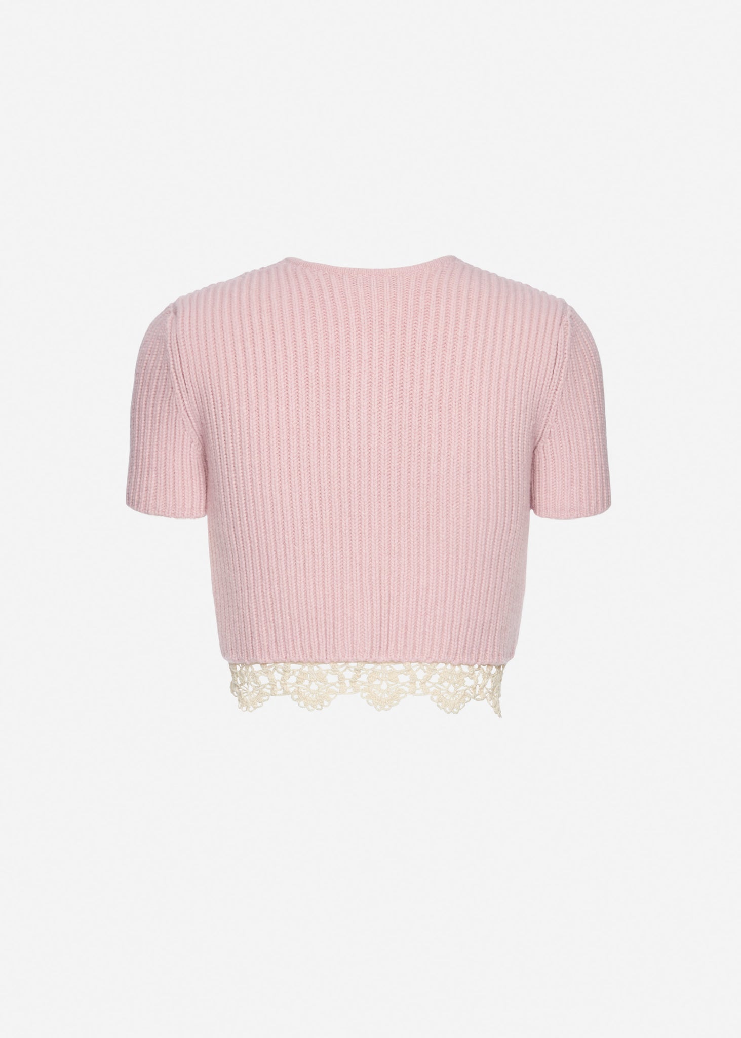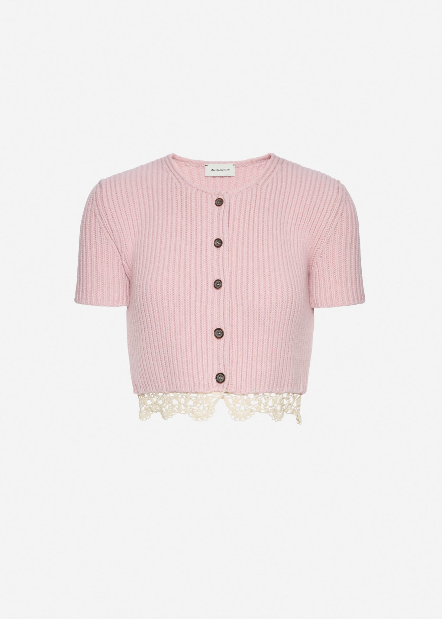 Short-sleeve cropped cardigan crafted from soft cashmere. Features a front button closure and delicate crochet lace trim along the hem.
