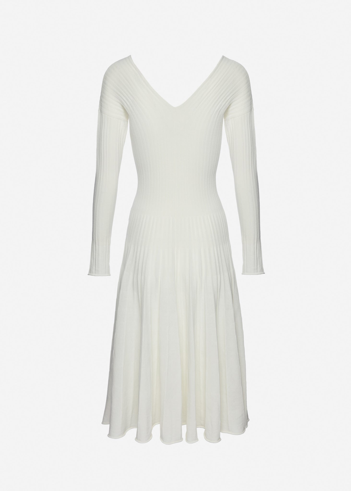 Sophisticated long-sleeve dress crafted from a fine ribbed knit. Features a deep V-neckline at the front and back, with a fitted bodice that flows into a softly flared skirt.