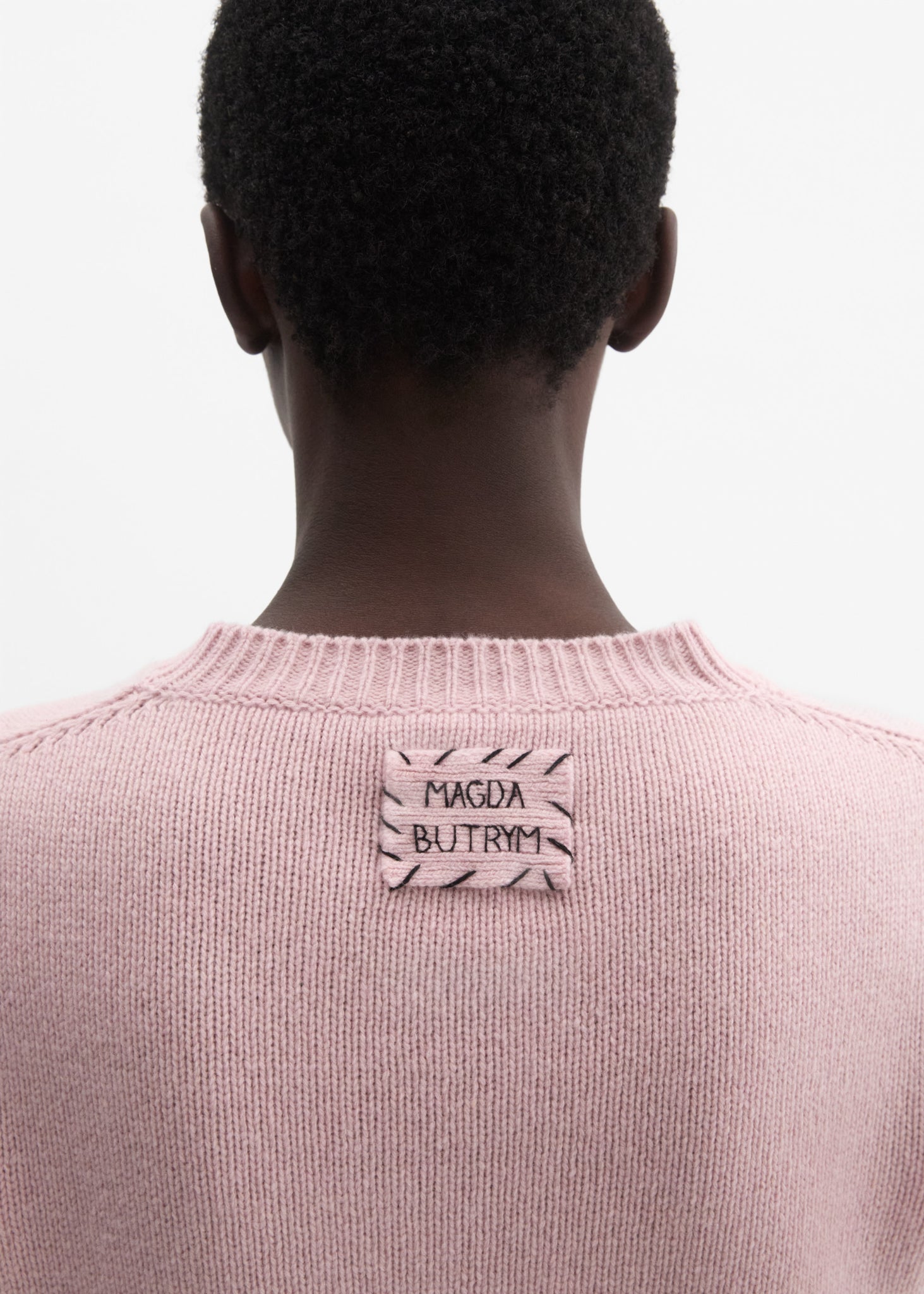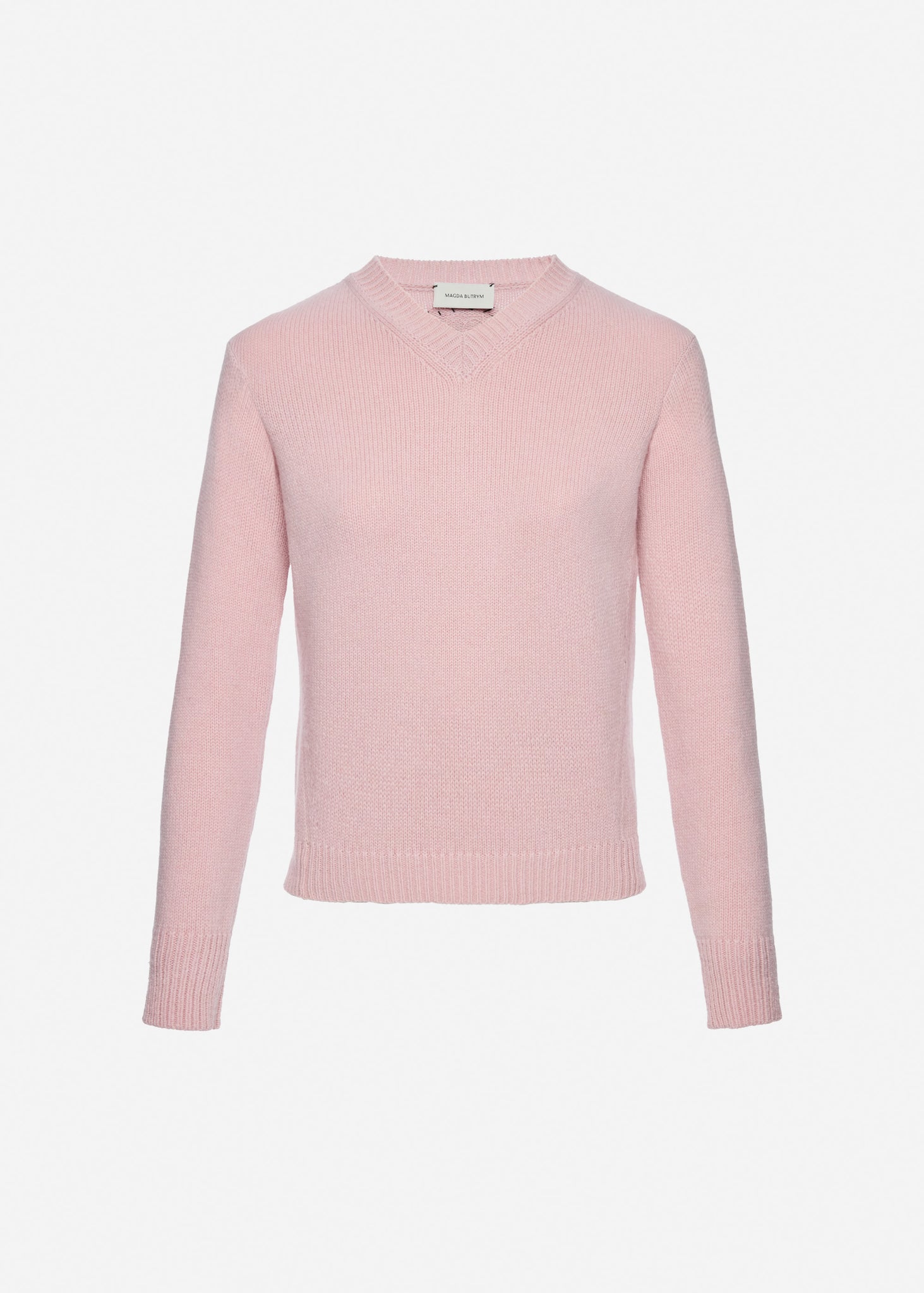Soft cashmere sweater with a classic V-neckline and ribbed trims. Features a hand-stitched signature label at the back yoke, highlighting artisanal craftsmanship. A timeless wardrobe staple with a refined finish.