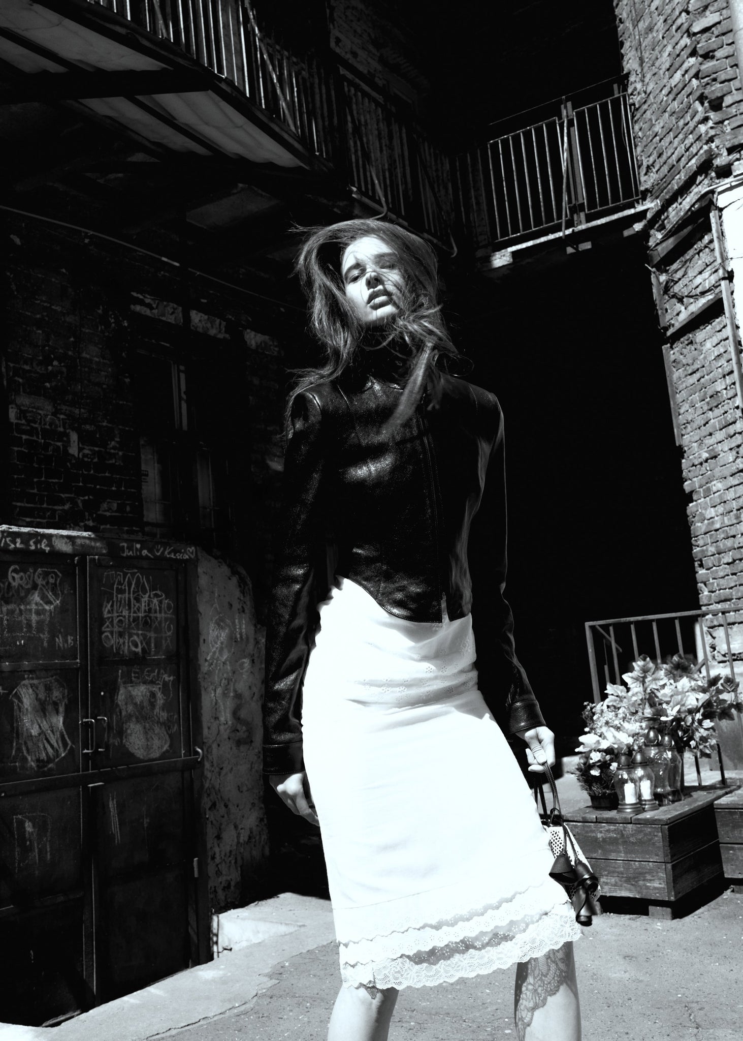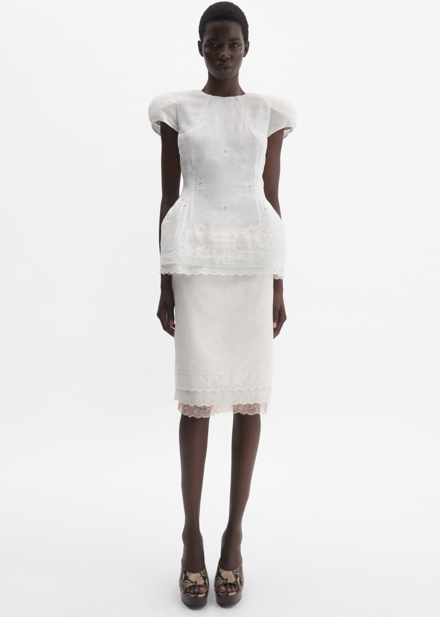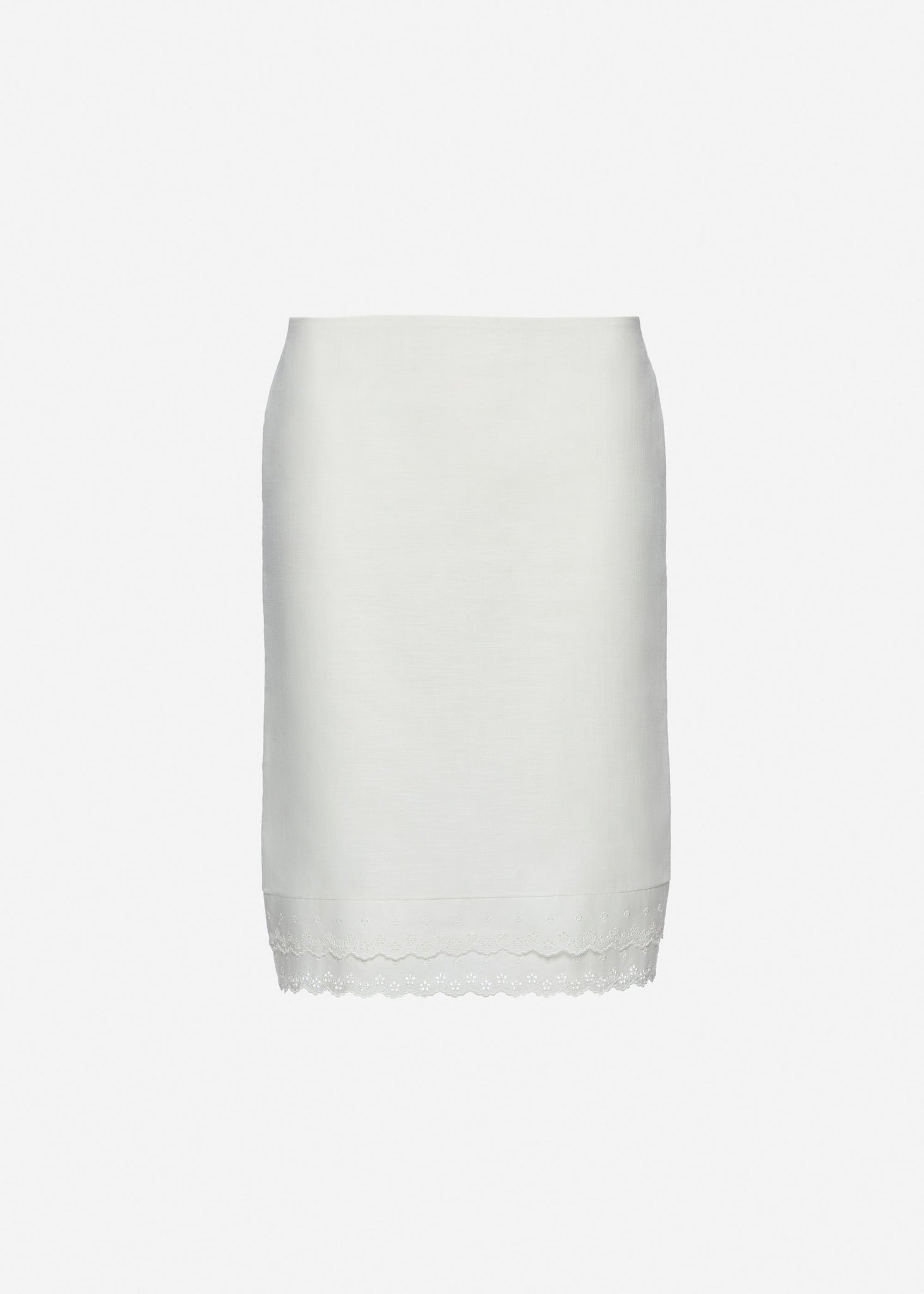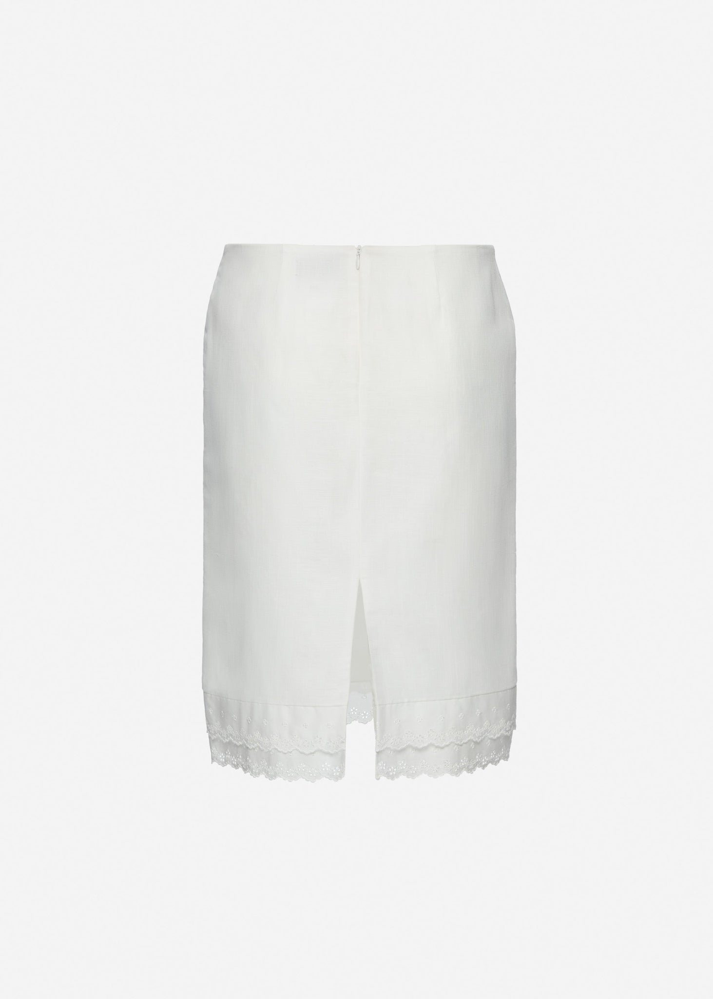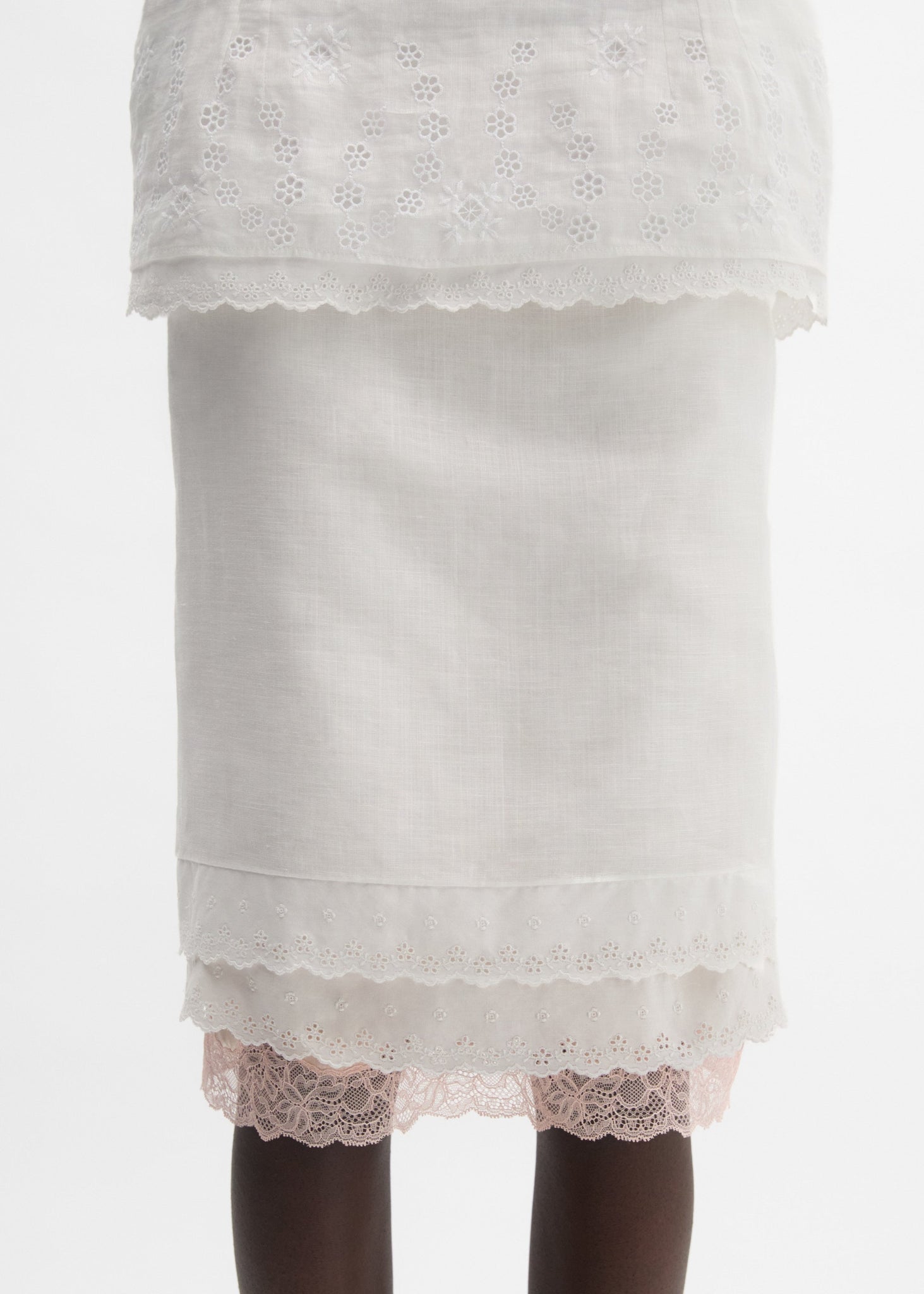 A pencil skirt crafted from cotton and linen blend. Designed with a double-layered construction, both layers delicately finished with scalloped lace detailing — the underlayer extending slightly beyond the top for a feminine touch. The waistline is cleanly structured without a waistband, adorned with decorative lace along the internal seam. Finished with a concealed back zip and a subtle slit for ease of movement.