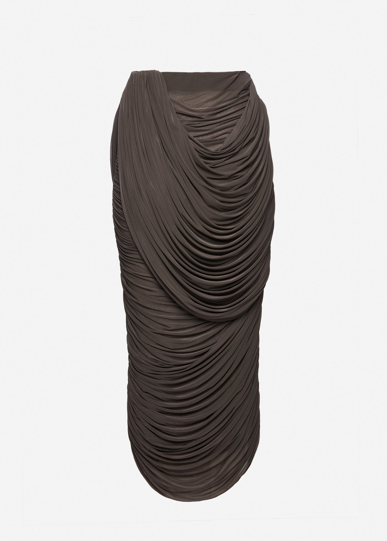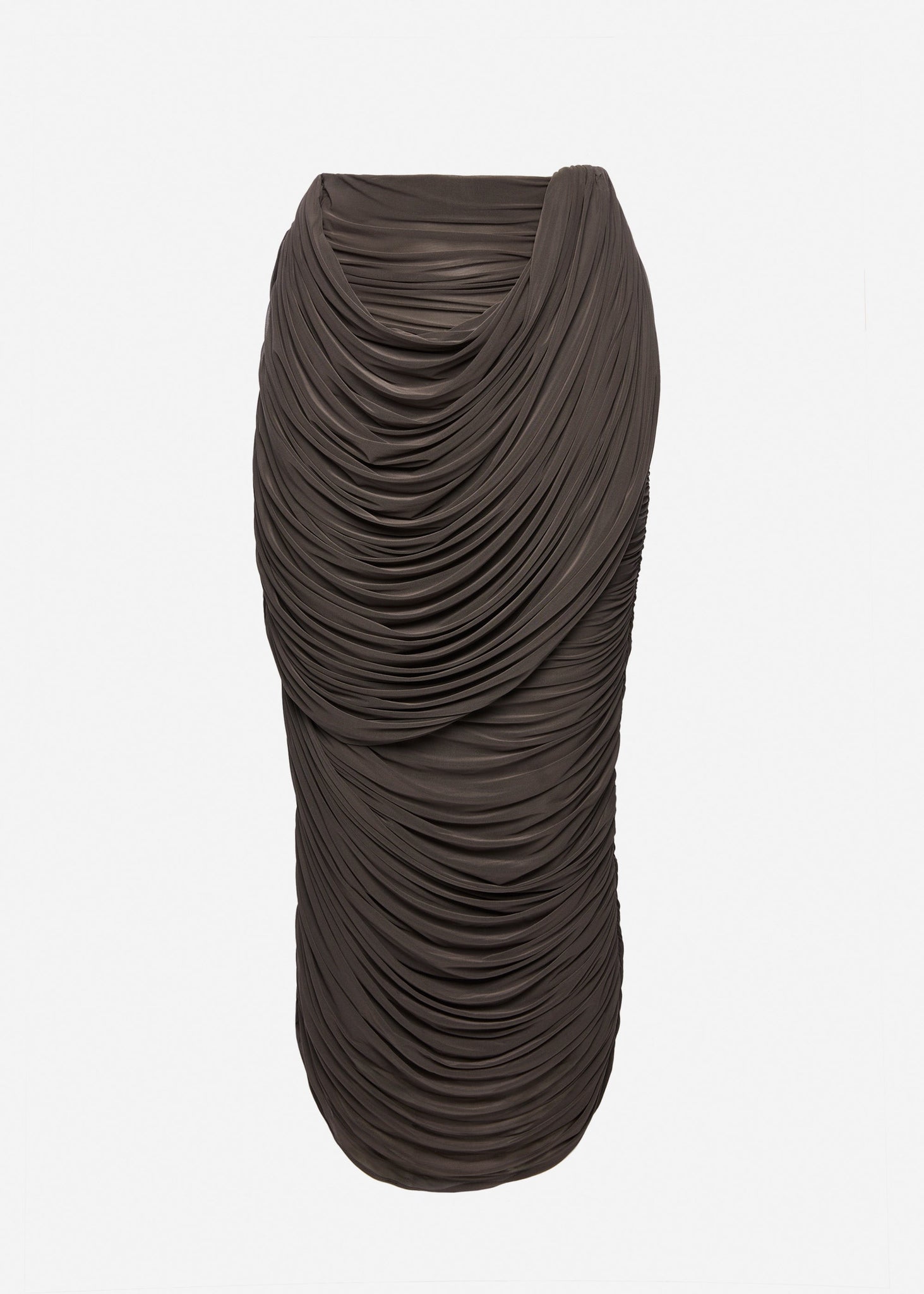 A silk and elastane midi skirt characterized by rich, fluid draping along the sides and additional gathered detailing that creates a sculptural, feminine silhouette. The waistband is softly elasticated, while a subtle boning insert on the left side provides structure. Finished with a smooth inner skirt for comfort and a flawless fit.