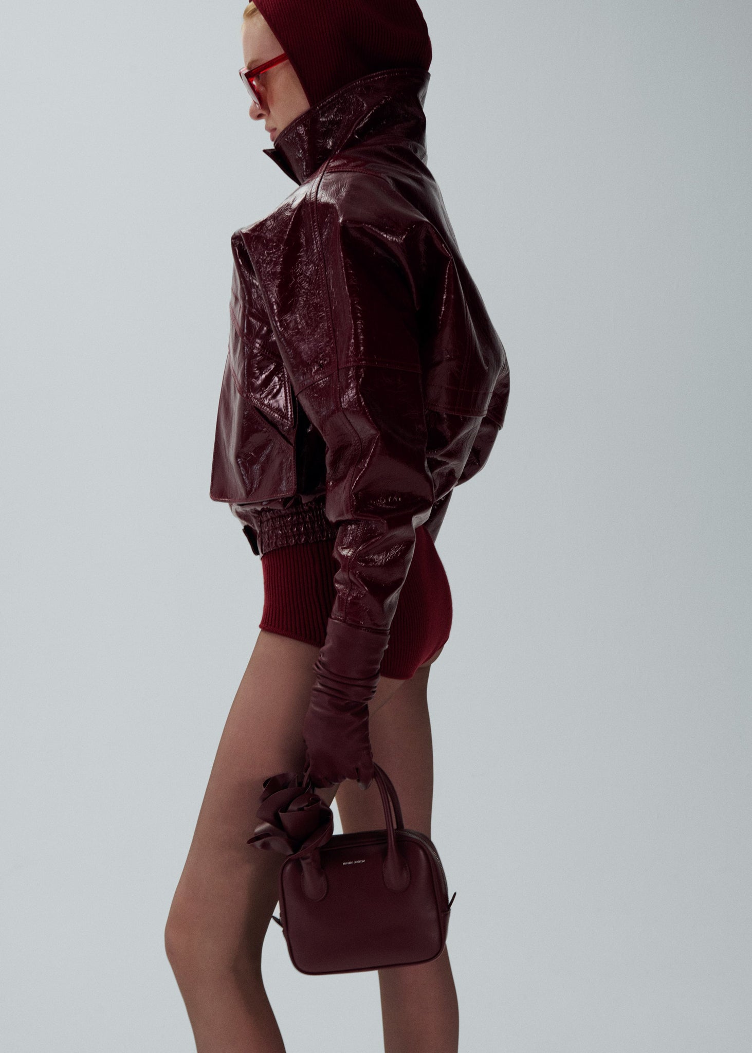 The Brigitte handbag in a modern square shape and burgundy leather, blending 90s nostalgia with Magda's heritage. Crafted in Italy with two top handles, a roomy interior, and top zipper, complete with a floral leather embellishment on the handle for added charm.