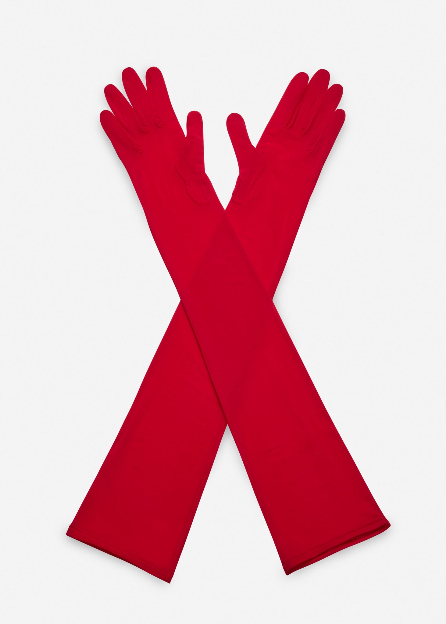 Crafted from cupro fabric, these mesh gloves offer a silky touch. The elongated design extends just below elbows, adding a refined, vintage-inspired silhouette perfect for evening wear or layering with modern ensembles.