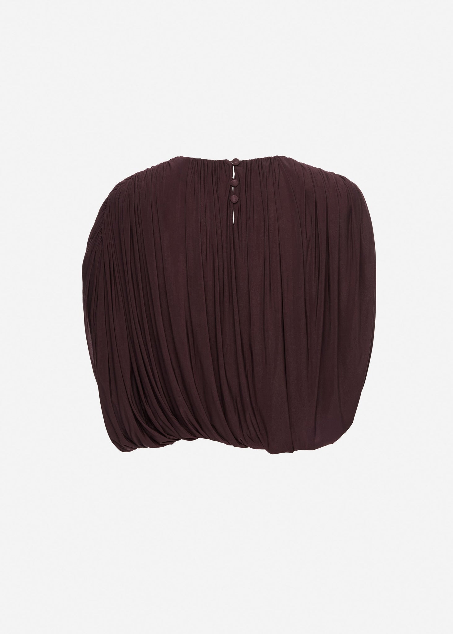 A sleeveless top with a round neckline and voluminous silhouette, created by heavy ruching at the shoulders and hem. Structured with shoulder padding and a gathered bubble hemline. The hem is cinched with elastic band.